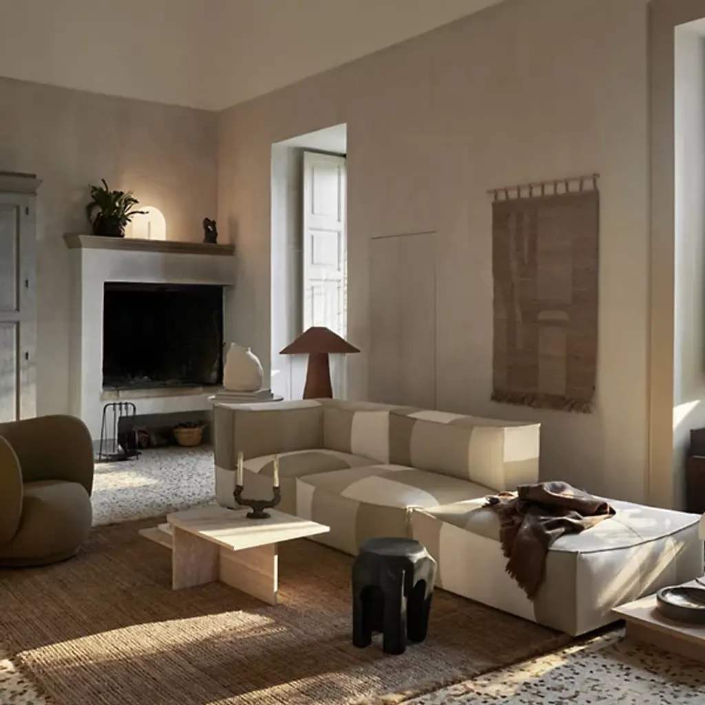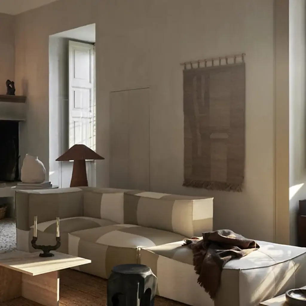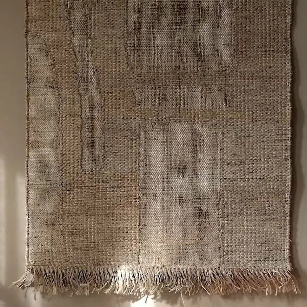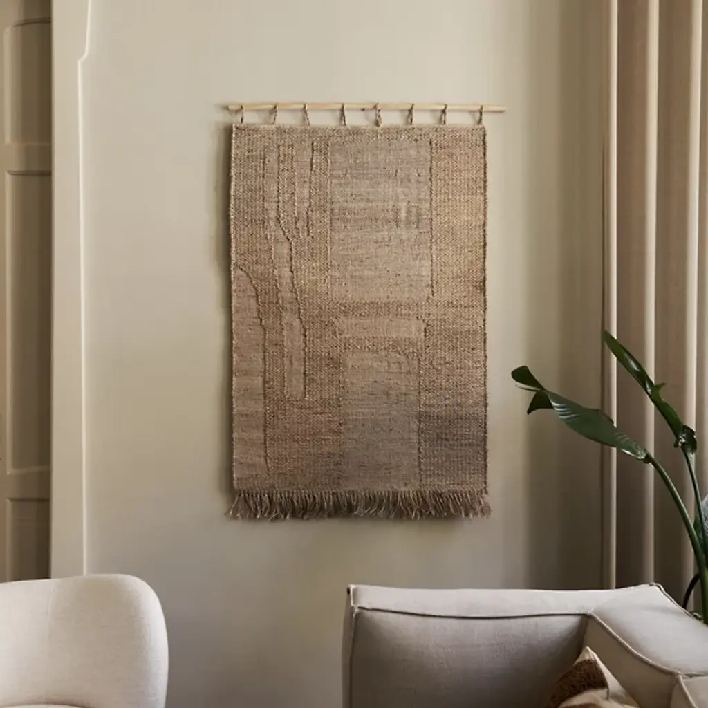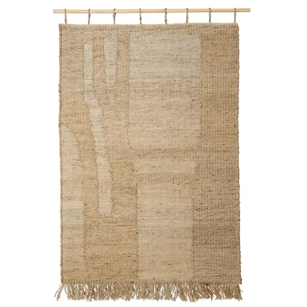The Harvest Wall Rug from Ferm LIVING adds an enjoyable tactile element to your space. Made entirely from natural jute, it hangs from a beech wooden bar and features contemporary geometric artwork complemented by soft, carefree fringes below. This rug works well amid Bohemian, coastal, and artisanal modern decor, providing its surroundings with an organic yet modern touch.