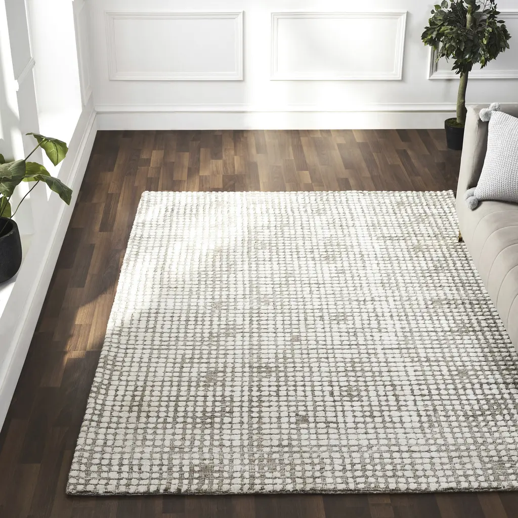 Available in five different sizes, this rug design holds equal beauty in every dimension. Composed of machine knitted micro polyester, it has a unique structure that incorporates texture to the space and the touch. With timeless neutral tones of taupe and ivory coming together in every square, it holds an effortless style fit for the luxe living space.
