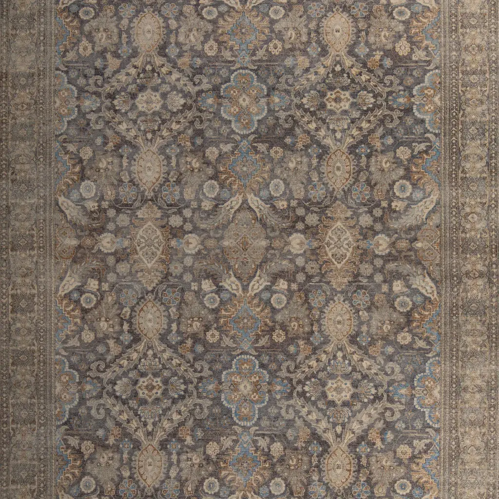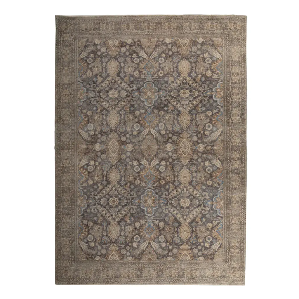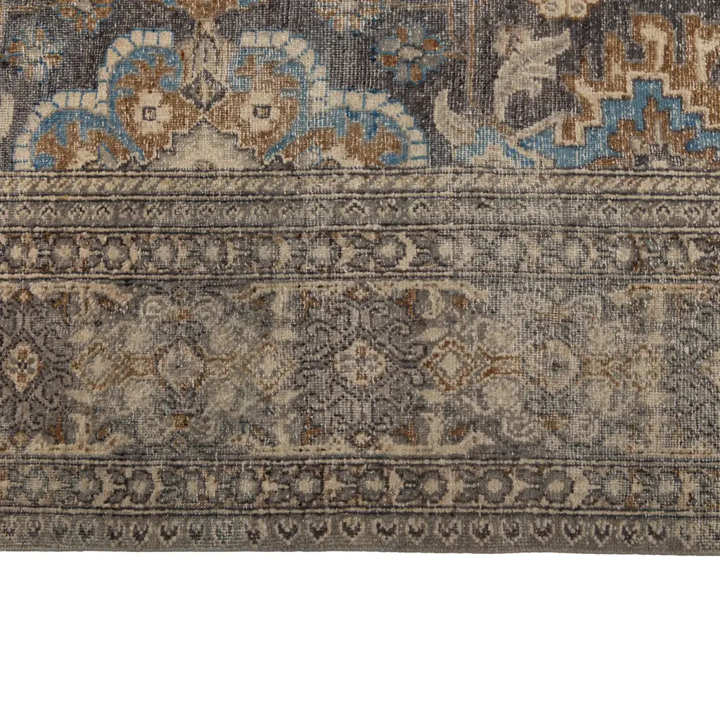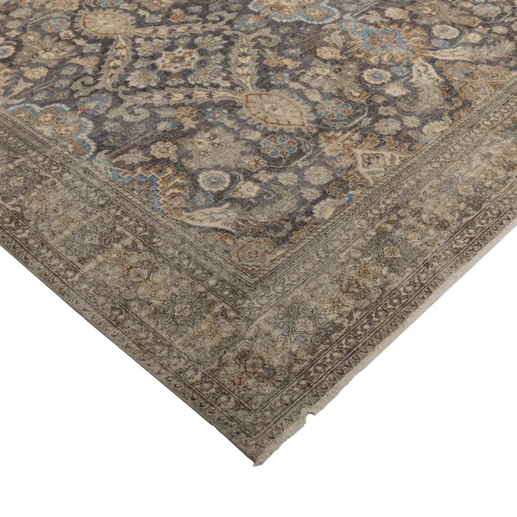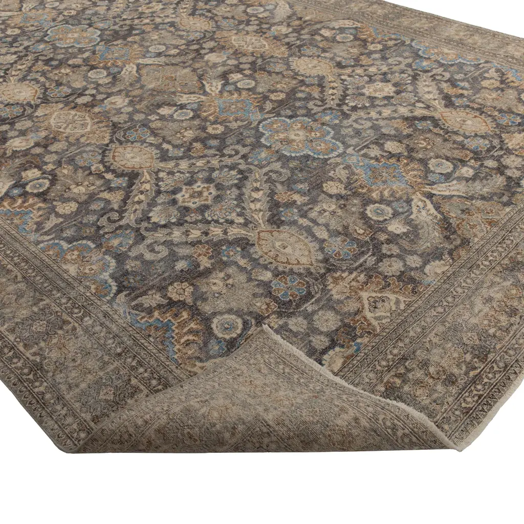 This Hazel and Brown Transitional Wool Rug - 10'x14' is hand-knotted by rug artisans in India to create a traditional floral design in a neutral modern color palette of hazel blue, cream, taupe, and grey-brown throughout the entirety of this one-of-a-kind rug. Enclosed with an intricate border, this area rug showcases the true art form of artisan rug making. Exclusively at abc carpet & home, the Sabideh Rug Collection features a mix of contemporary and vintage rugs inspired by the artistic technique of placing a carpet in the sun to neutralize its original color for a more distressed and muted appearance. Meticulously created by hand, these one-of-a-kind rugs instantly transform any room.