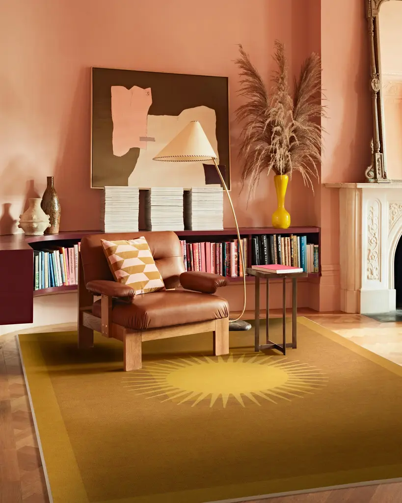 Sun-drench your favorite room with our Matthew Williamson Helios Gold Rug. Inspired by Matthew���s travels to Spain, this beaming design combines warm, minimalist shapes that mimic a retro aesthetic. The light yellow border and warm yellow medallion radiate against a deep ochre background. Water-resistant, stain-resistant, and machine-washable. Rug colors may vary slightly according to your device and the lighting in your space.