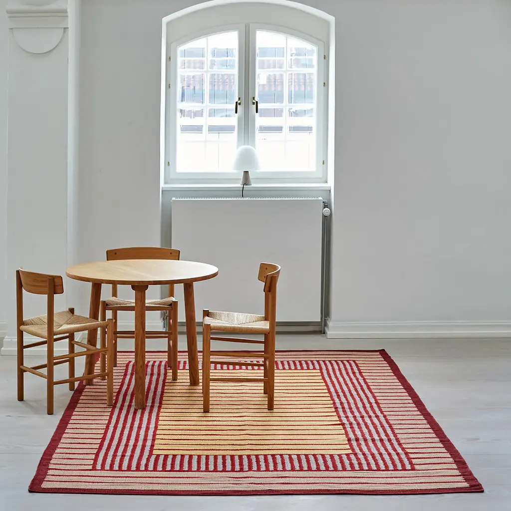 The Hemp Collection by Tanja Kirst is handwoven with Italian hemp yarn. Each thread consists of 50 thin threads spun together and dyed in bio color. The collection is part of an ongoing project investigating how the familiar hemp plant can be transformed into durable and sustainable woven textiles. The fact that hemp requires little water, can be cultivated without fertilizer and improves soil structure and adds nutrients as it grows – makes the hemp plant important in the aim for a more sustainable textile production. Handwoven in a flat weave construction with color and weft effect. Underlay carpet is included.