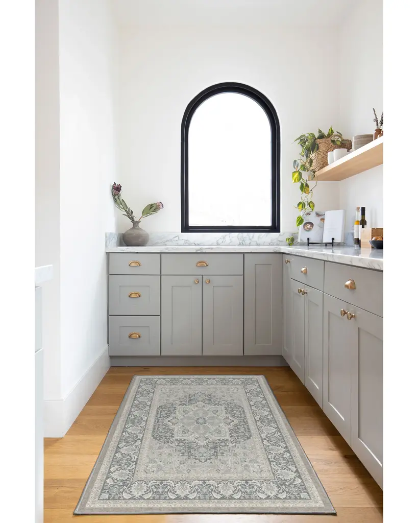 The Hendesi Heriz Abalone Rug is inspired by classic Persian-style rugs. Tinted in neutral colors, this rug features an oversized medallion in the center surrounded by ornate borders. Water-resistant, stain-resistant, and machine-washable.