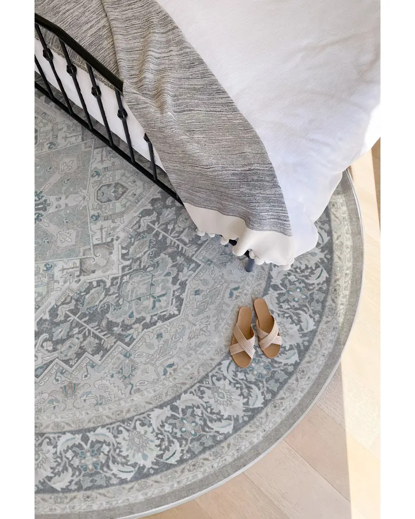 The Hendesi Heriz Abalone Rug is inspired by classic Persian-style rugs. Tinted in neutral colors, this rug features an oversized medallion in the center surrounded by ornate borders.