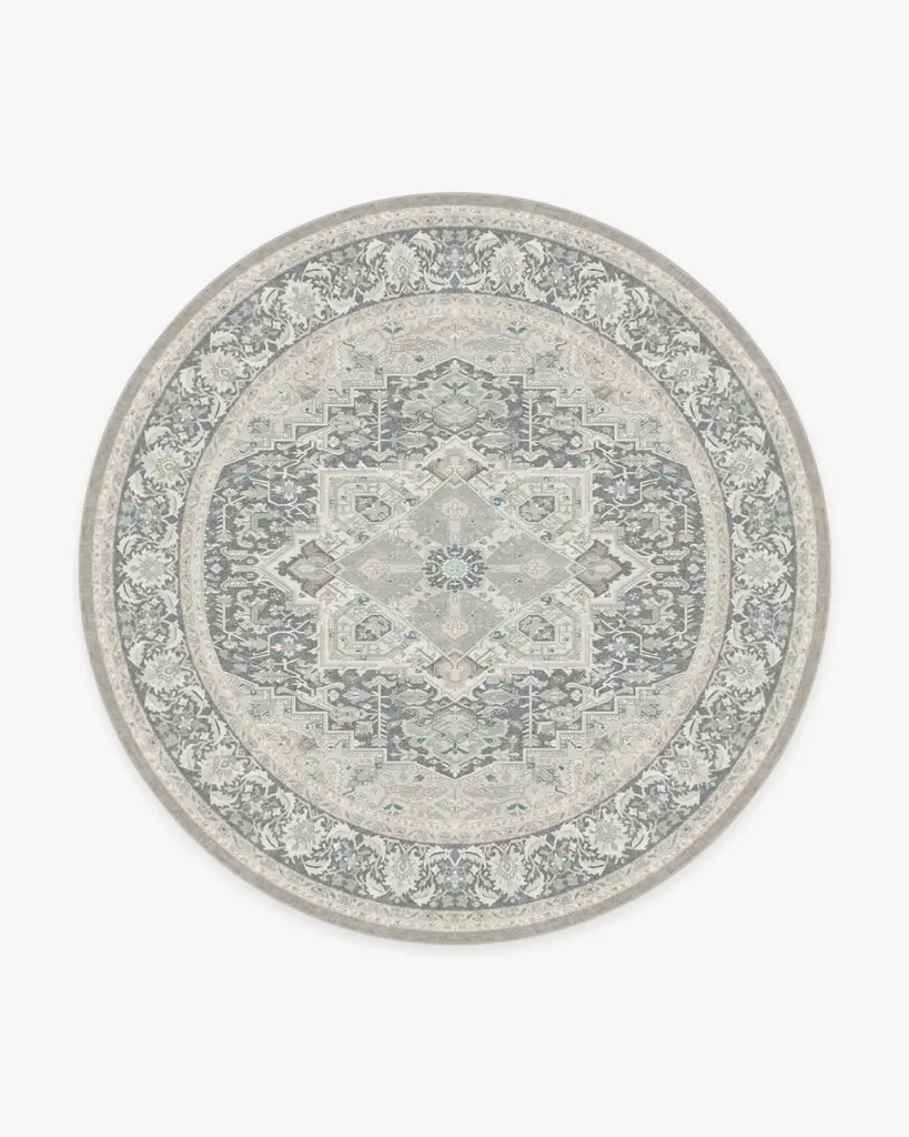 The Hendesi Heriz Abalone Rug is inspired by classic Persian-style rugs. Tinted in neutral colors, this rug features an oversized medallion in the center surrounded by ornate borders. Water-resistant, stain-resistant, and machine-washable.