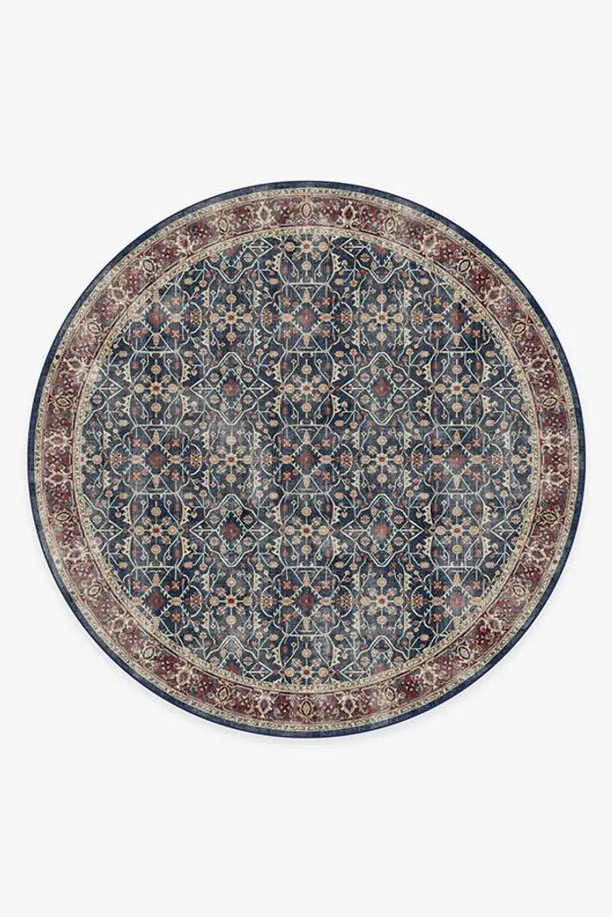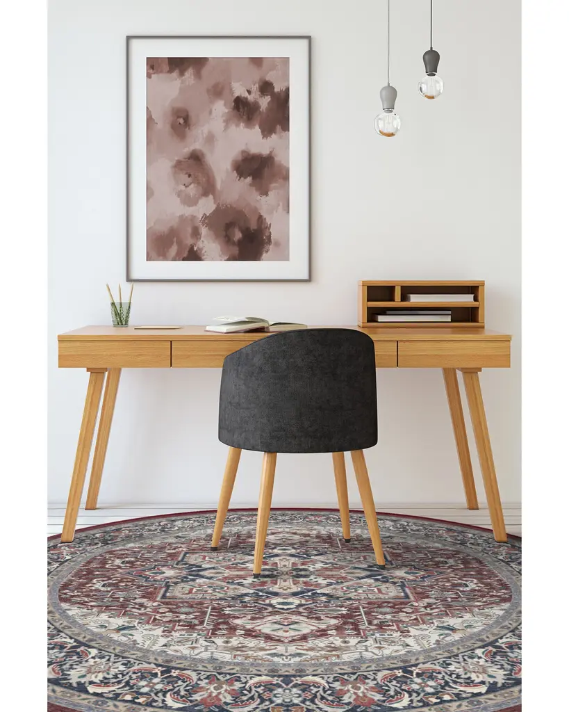 The Hendesi Heriz Bordeaux Rug is a contemporary take on the classic Persian style rug design. Featuring a wine-colored medallion centerpiece, flanked by a cool blue border motif, this rug lends an air of sophistication to any room.