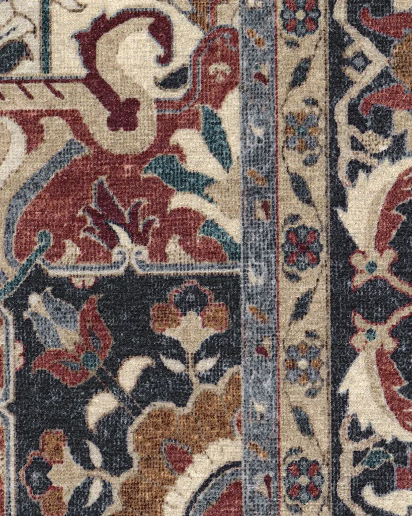 The Hendesi Heriz Bordeaux Rug is a contemporary take on the classic Persian style rug design. Featuring a wine-colored medallion centerpiece, flanked by a cool blue border motif, this rug lends an air of sophistication to any room.