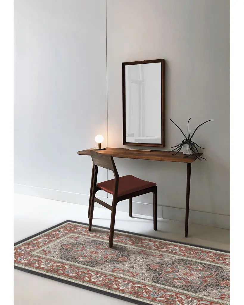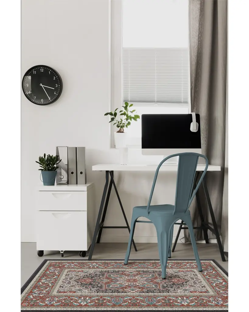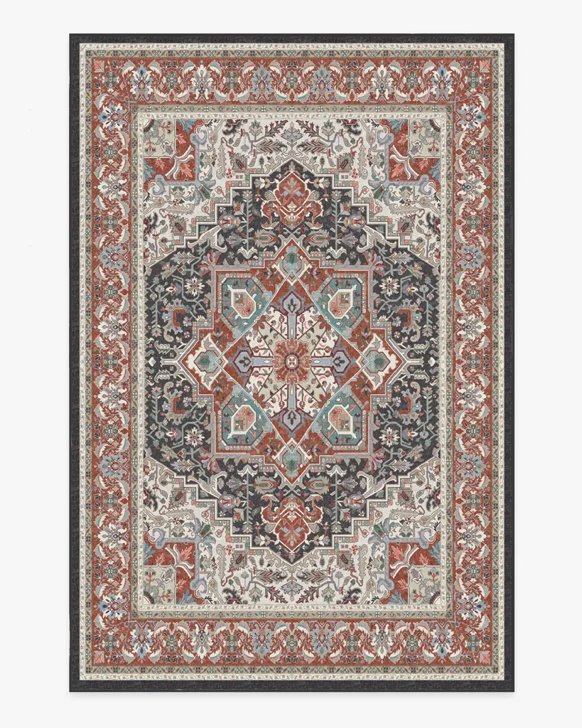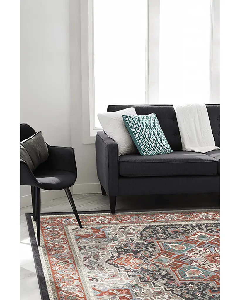 The Hendesi Heriz Garnet Rug features a traditional, grey and red Persian rug design with a centerpiece medallion and border motif.