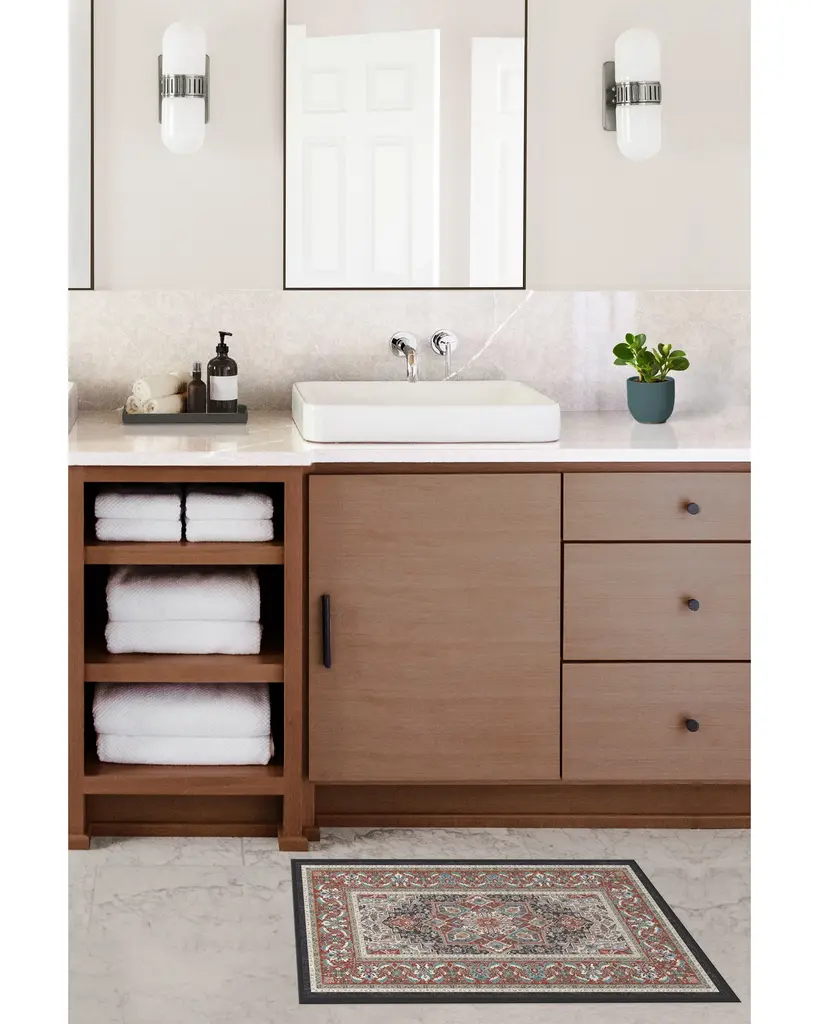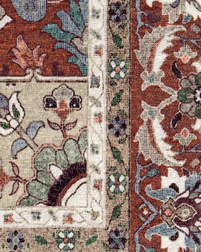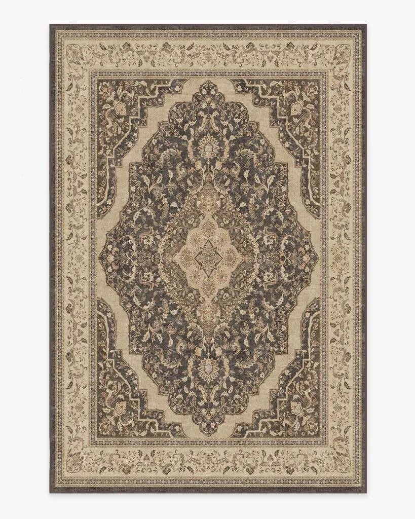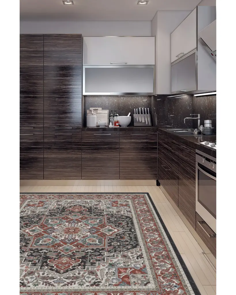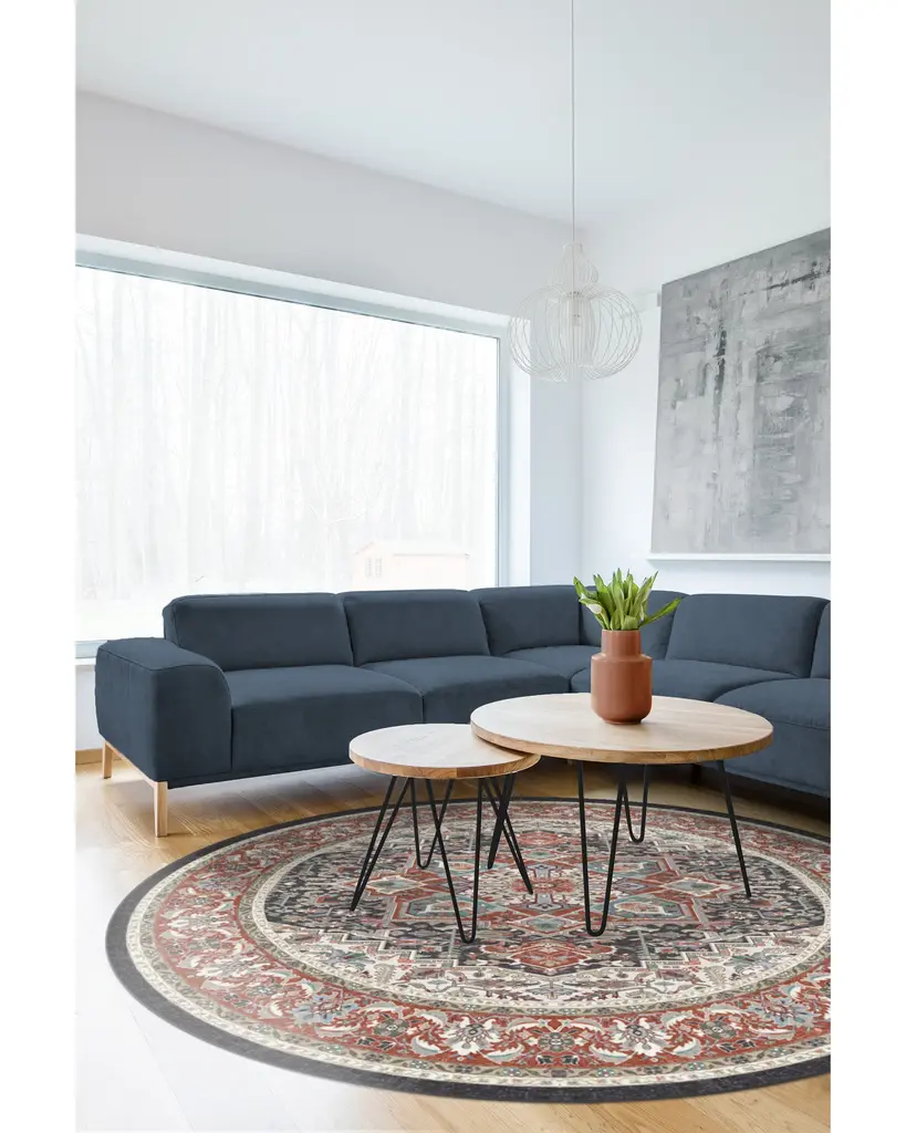 The Hendesi Heriz Garnet Rug features a traditional, grey and red Persian rug design with a centerpiece medallion and border motif.