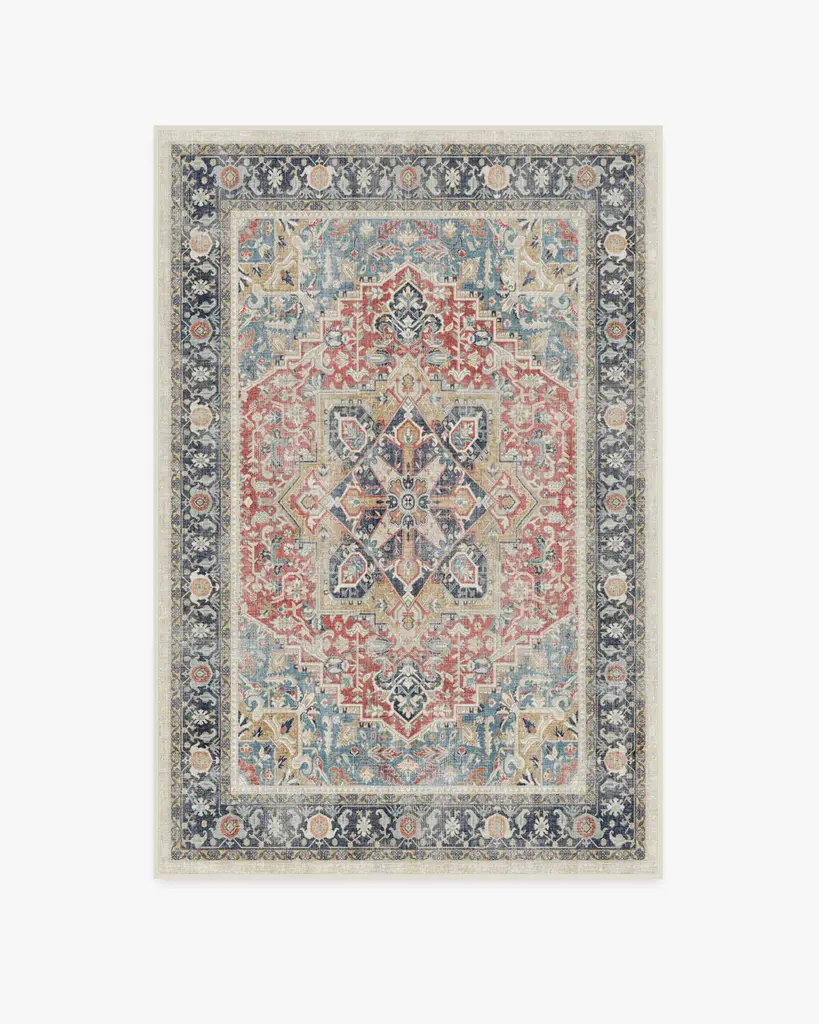 Inspired by the timeless designs of Persian-style rugs. Our Hendesi Heriz Sage Rug features a geometric medallion surrounded by an intricate floral border, colored in contemporary shades of sage green and taupe and accented with rose gold, ombre orange, and dijon yellow. Water-resistant, stain-resistant, and machine-washable.