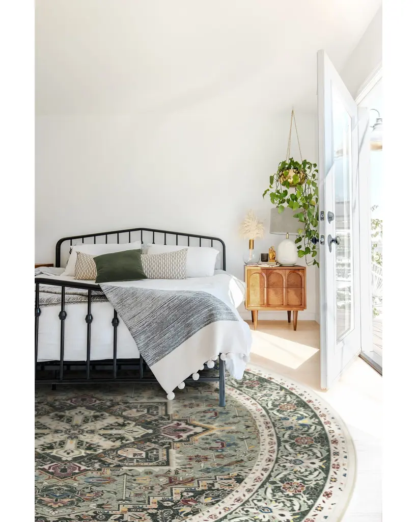 Inspired by the timeless designs of Persian-style rugs. Our Hendesi Heriz Sage Rug features a geometric medallion surrounded by an intricate floral border, colored in contemporary shades of sage green and taupe and accented with rose gold, ombre orange, and dijon yellow. Water-resistant, stain-resistant, and machine-washable.