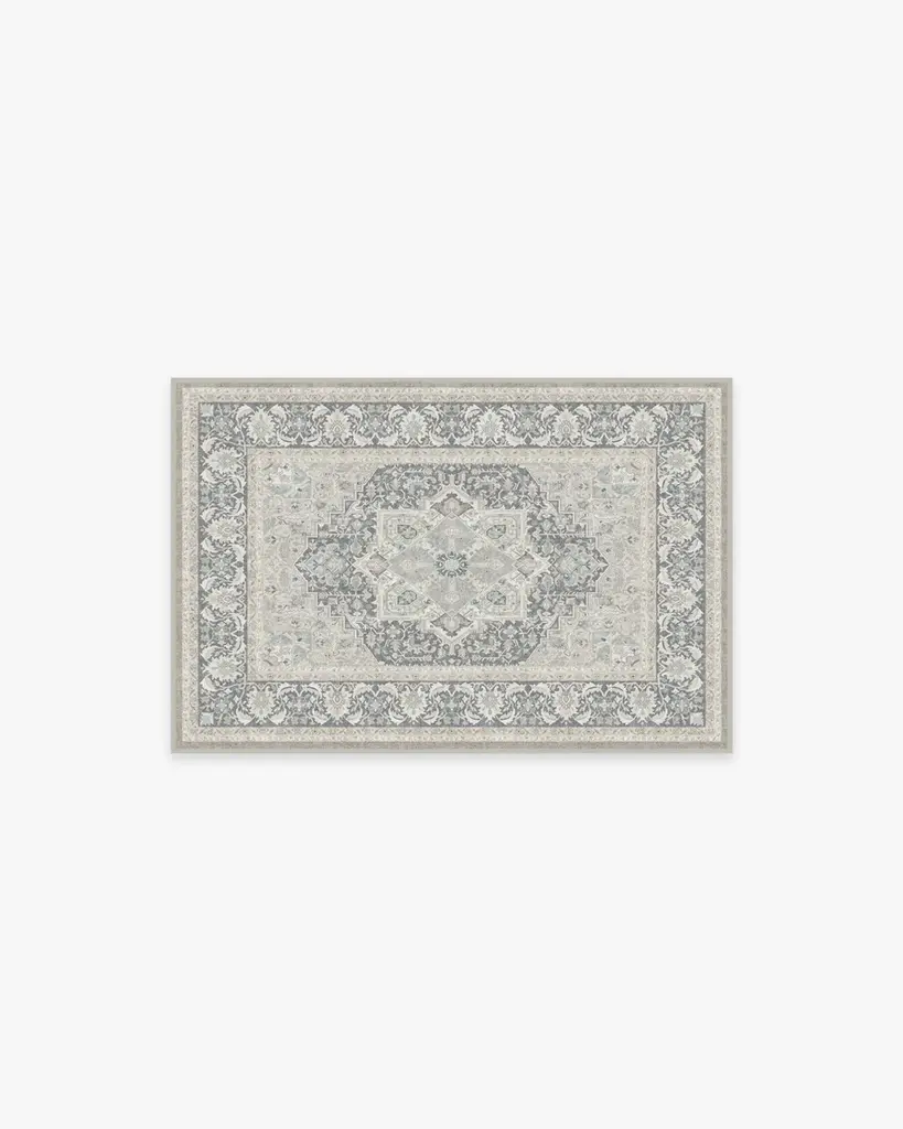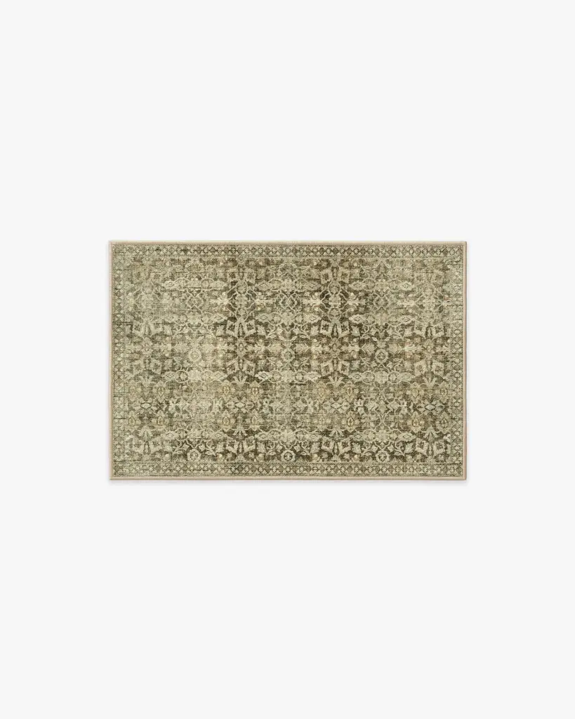 Inspired by the timeless designs of Persian-style rugs. Our Hendesi Heriz Sage Rug features a geometric medallion surrounded by an intricate floral border, colored in contemporary shades of sage green and taupe and accented with rose gold, ombre orange, and dijon yellow. Water-resistant, stain-resistant, and machine-washable.