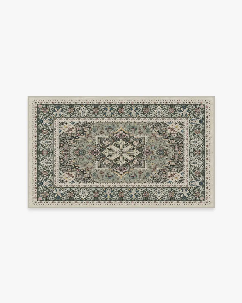 Inspired by the timeless designs of Persian-style rugs. Our Hendesi Heriz Sage Rug features a geometric medallion surrounded by an intricate floral border, colored in contemporary shades of sage green and taupe and accented with rose gold, ombre orange, and dijon yellow. Water-resistant, stain-resistant, and machine-washable.