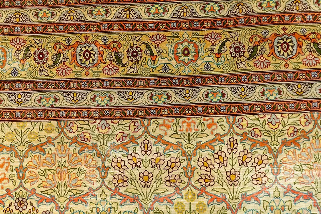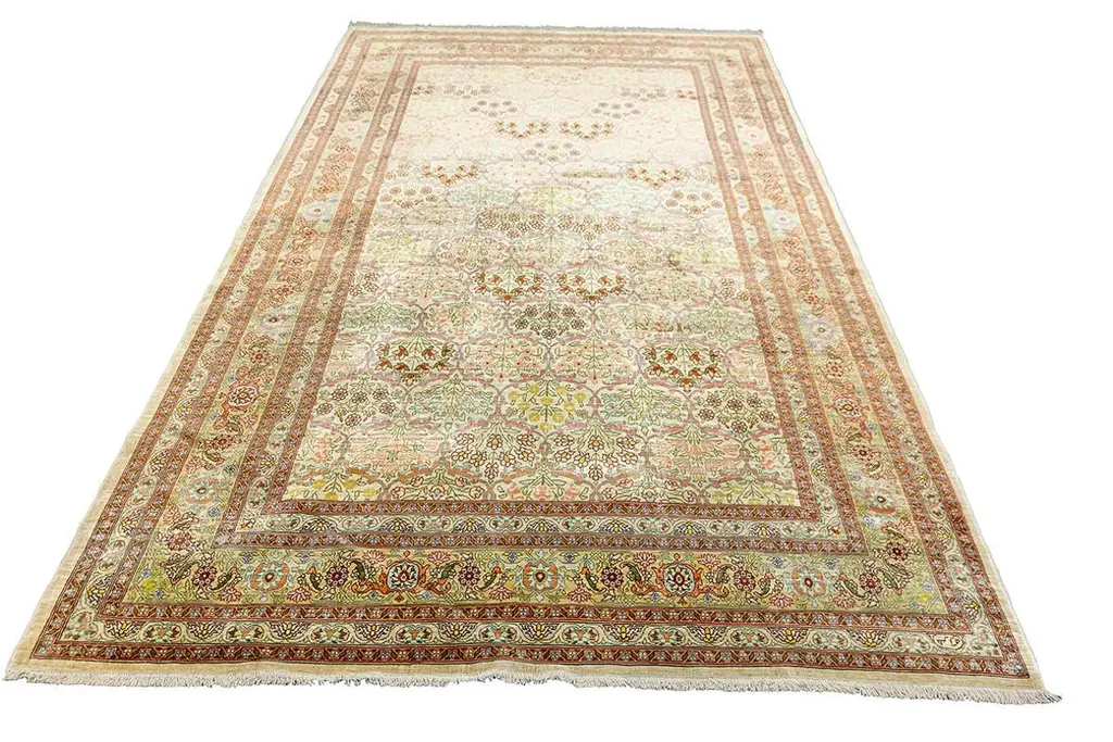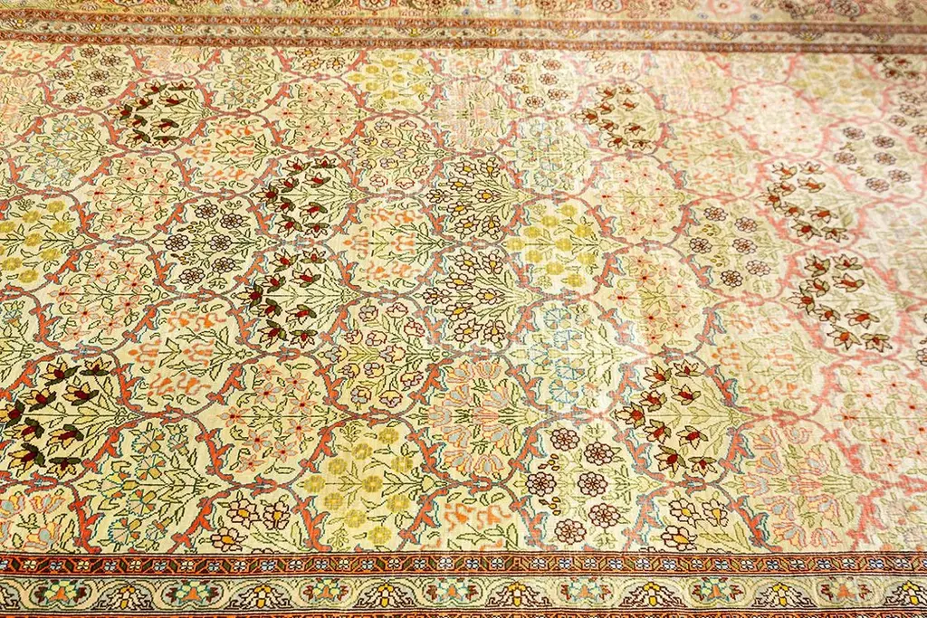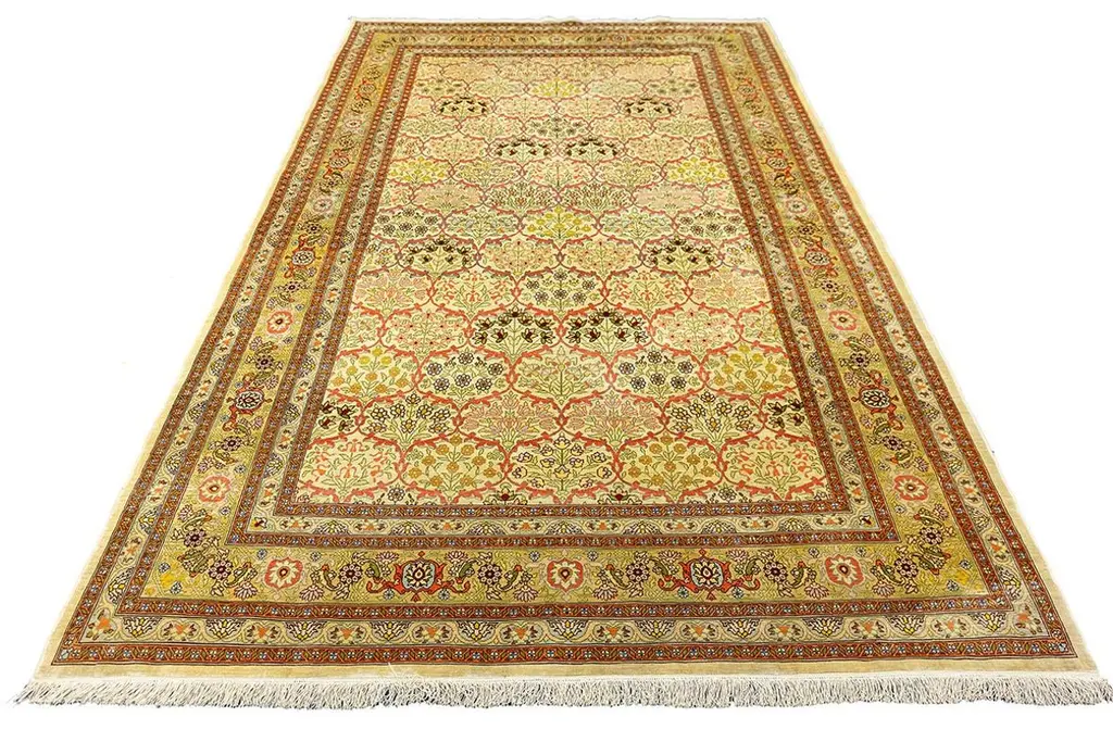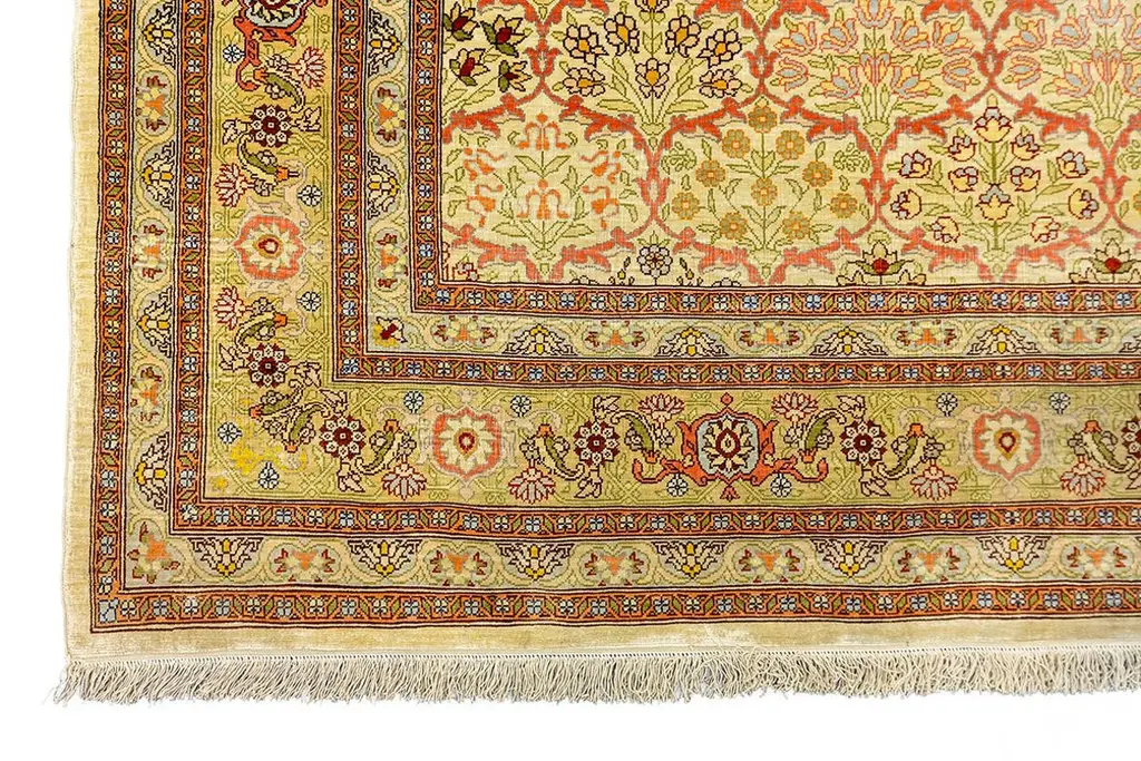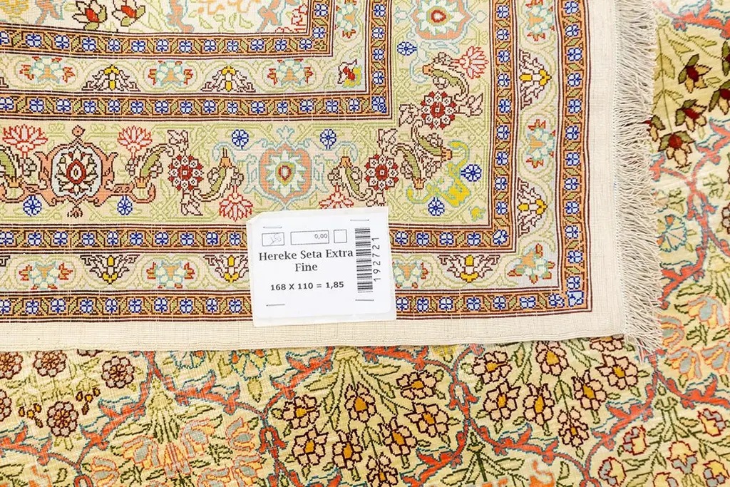 This extra-fine Hereke rug, measuring 110 x 168 cm, exemplifies the pinnacle of Turkish rug craftsmanship. Its intricate floral motifs are meticulously woven, creating a symmetrical design that radiates sophistication and elegance. The color palette features soft ivory, gold, and pastel tones, accented with richer hues to add depth and character. Crafted with exceptional precision, this rug highlights the renowned Hereke technique, often considered a hallmark of luxury in handwoven carpets. Its delicate details and superior quality make it an exquisite choice for collectors or anyone seeking to add a touch of opulence to their interior décor.