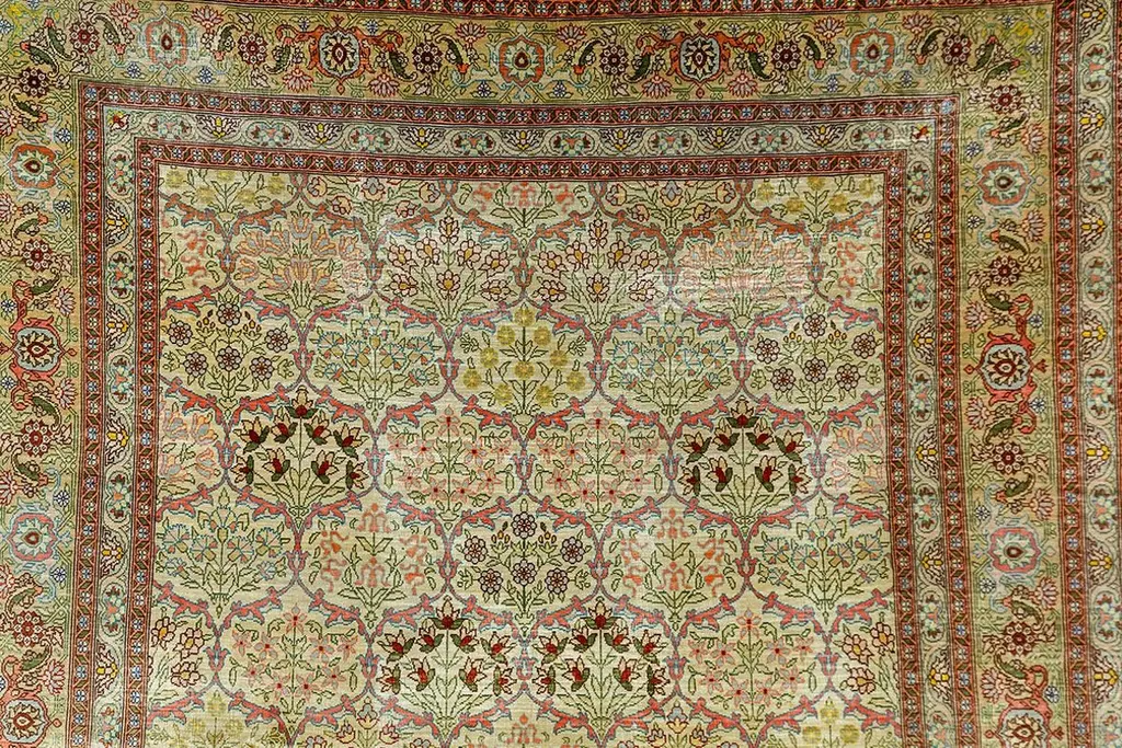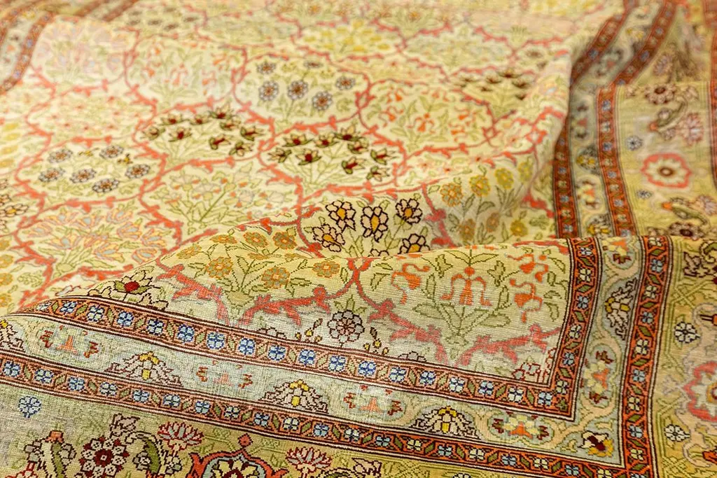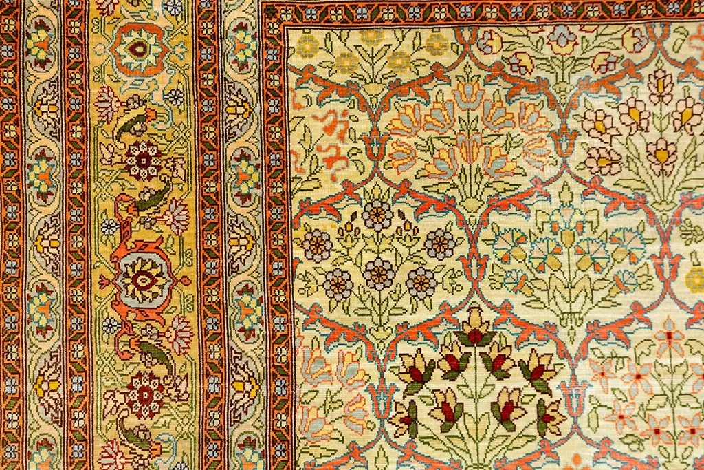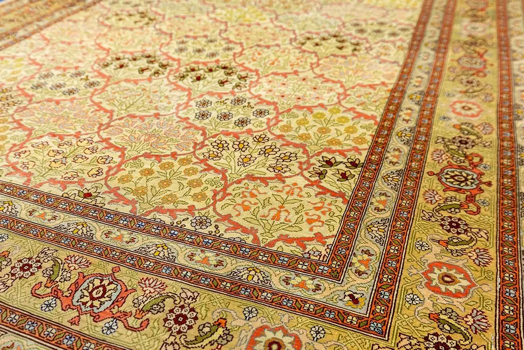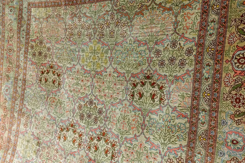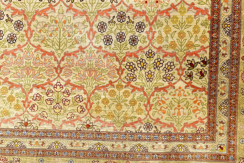 This extra-fine Hereke rug, measuring 110 x 168 cm, exemplifies the pinnacle of Turkish rug craftsmanship. Its intricate floral motifs are meticulously woven, creating a symmetrical design that radiates sophistication and elegance. The color palette features soft ivory, gold, and pastel tones, accented with richer hues to add depth and character. Crafted with exceptional precision, this rug highlights the renowned Hereke technique, often considered a hallmark of luxury in handwoven carpets. Its delicate details and superior quality make it an exquisite choice for collectors or anyone seeking to add a touch of opulence to their interior décor.