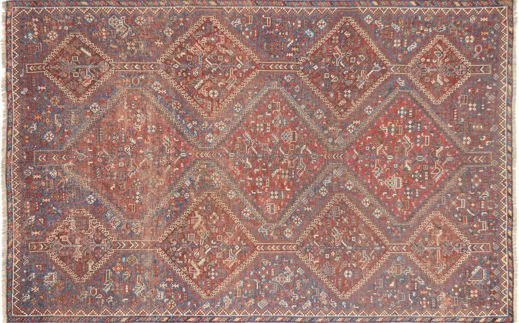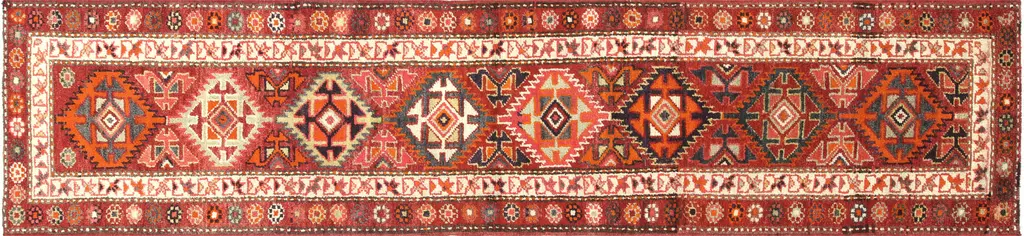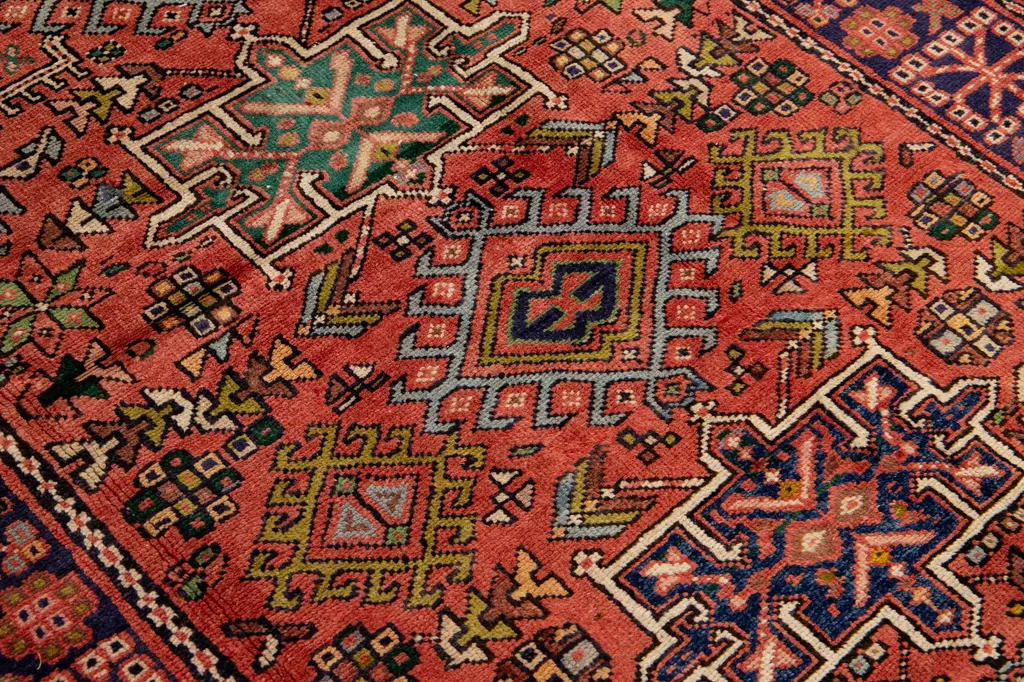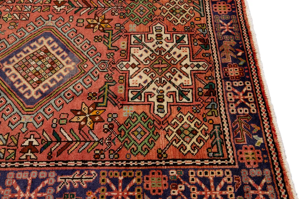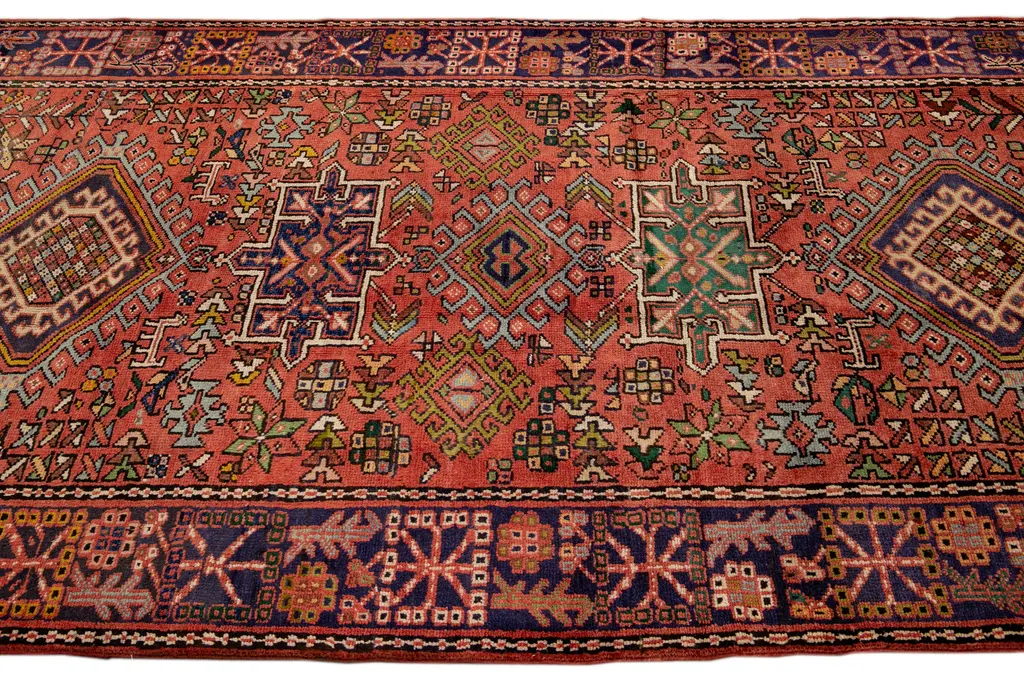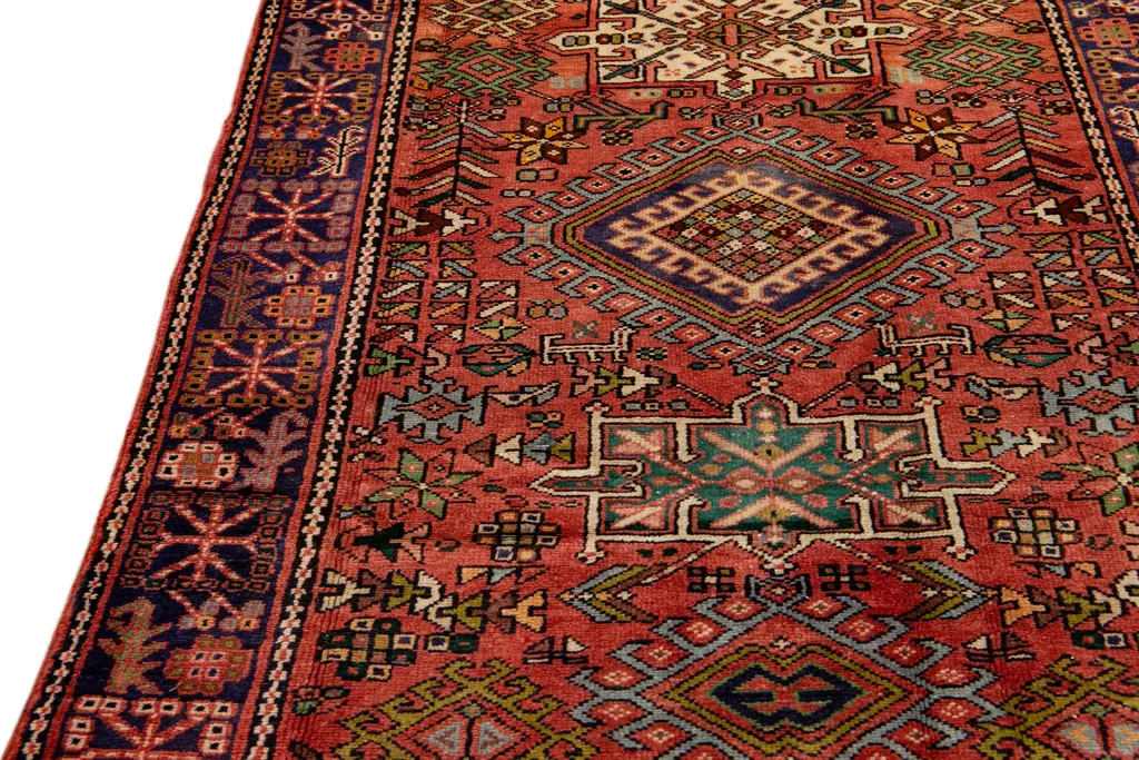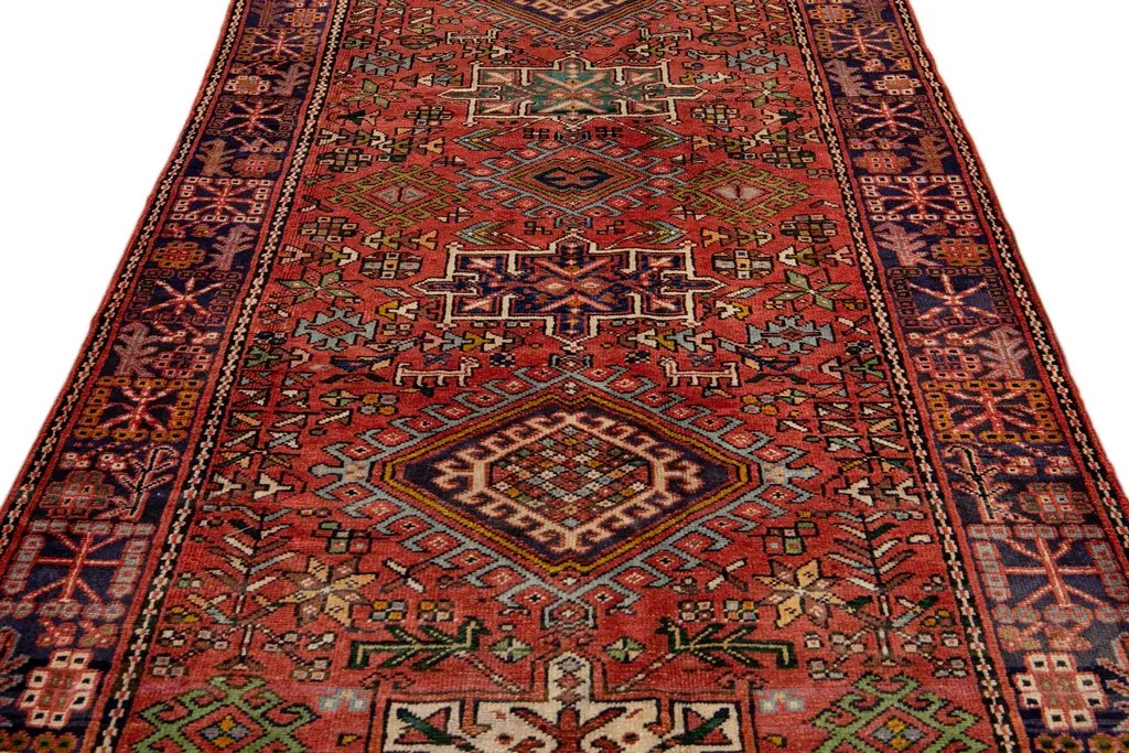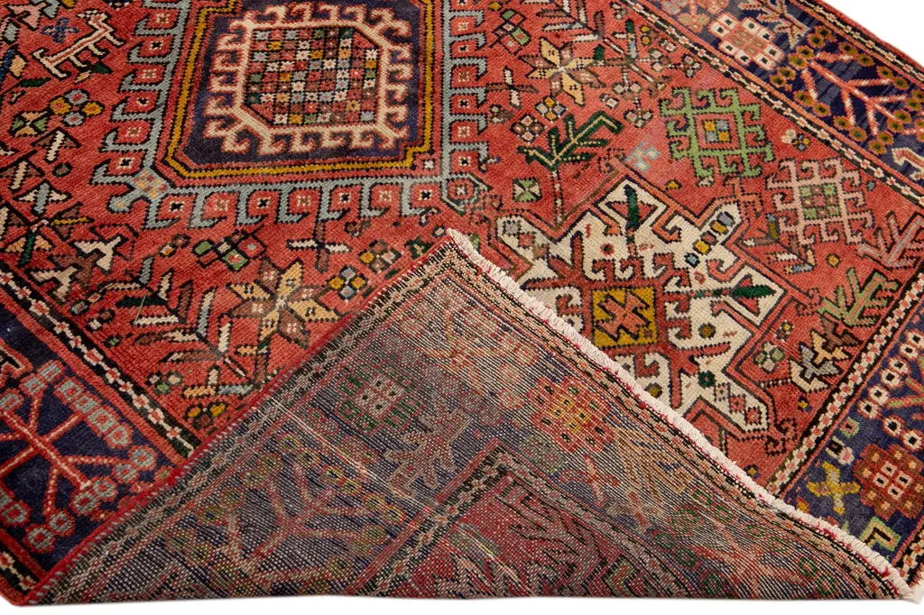 Beautiful Antique Heriz Handmade Wool rug with an all-over red field. This piece has multicolor accents in a gorgeous all-over geometric medallion design. This rug measures: 4'5" x 10'4".