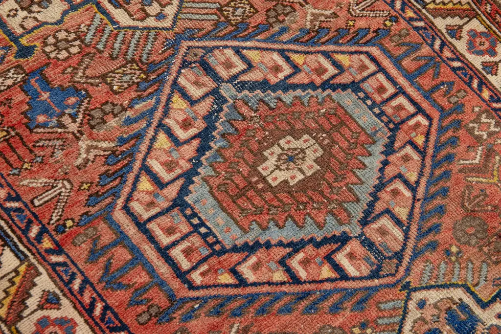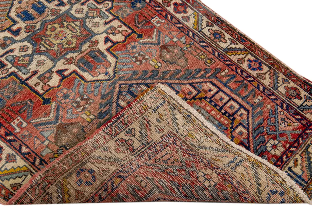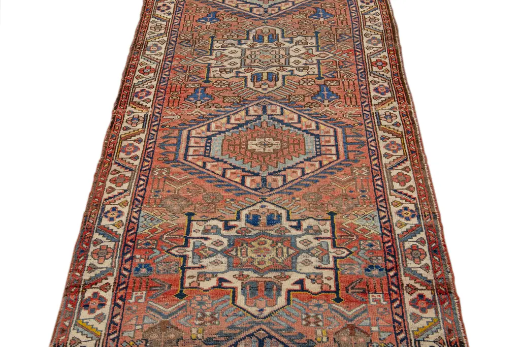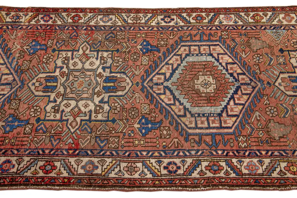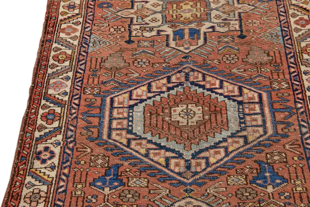 Beautiful Antique Heriz Handmade Wool rug with an all-over rust field. This piece has multicolor accents in a gorgeous all-over geometric medallion design. This rug measures: 2'11" x 11'3"