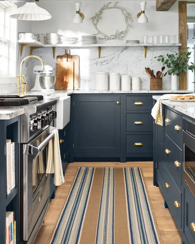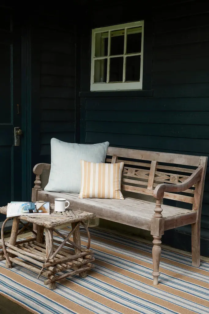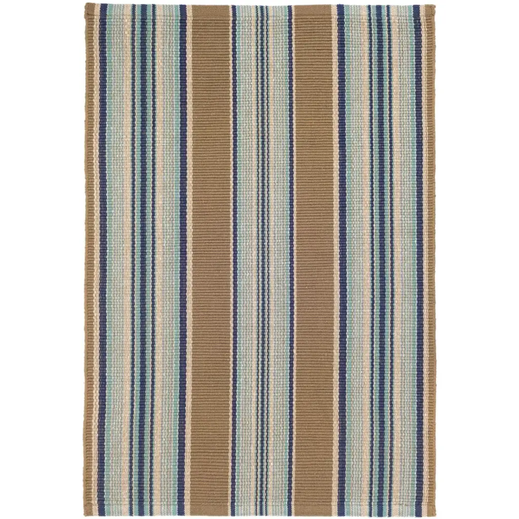 Whether you're at the lakehouse or in the comfort of your own home, this eco-friendly indoor/outdoor rug will transport you shoreside with its stripes of aqua, indigo, and deep sand.