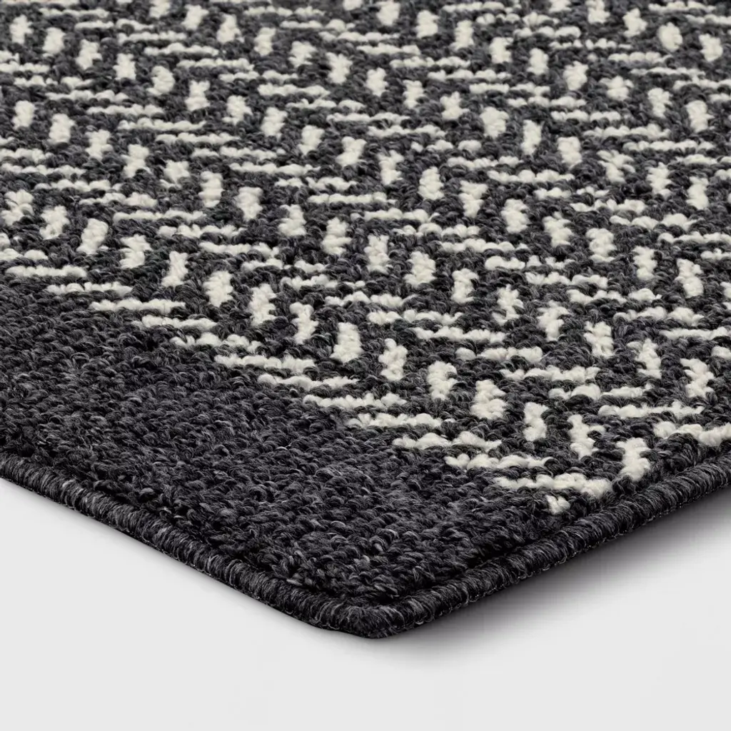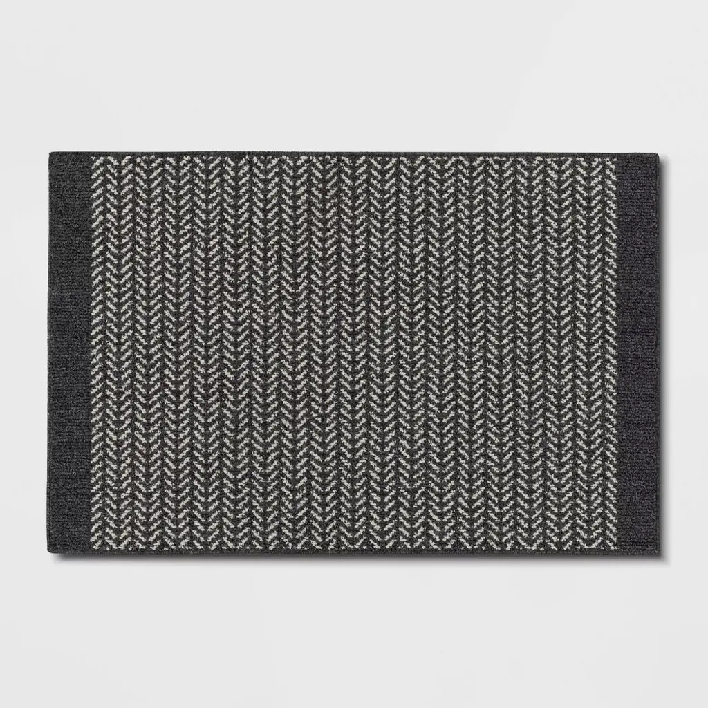 Tie together any room's decor with this Herringbone Accent Rug from Threshold™. This accent rug showcases a gray herringbone pattern on a black backdrop for an eye-catching look that coordinates well with any interior decor. Made from soft tufted fabric with a low pile height, this indoor rug is ideal for placement in high-traffic areas like your den or entryway and is easy to spot clean. The fade- and stain-resistant construction offers lasting use, and skid-resistant latex backing helps to keep it from sliding around your floor. Threshold™: Quality & Design / Casual classics for house and home.
