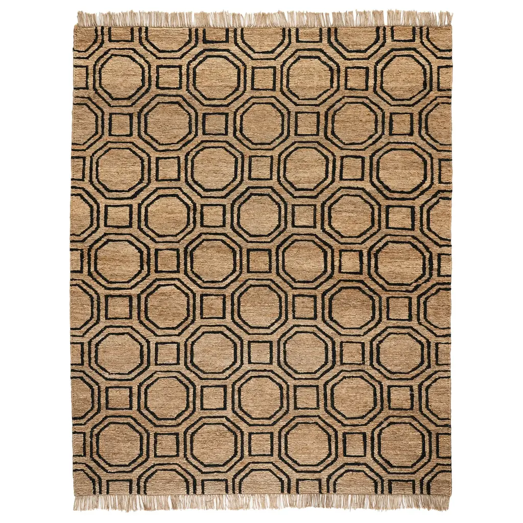 Interlocking inky tiles create soothing symmetrical shapes on a natural backdrop. Hardworking undyed jute is hand knotted for subtle texture and surprisingly soft surface interest, a modern and unique addition to any decor.