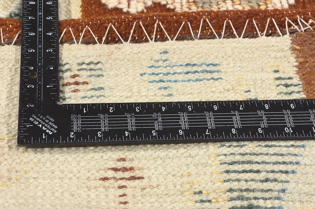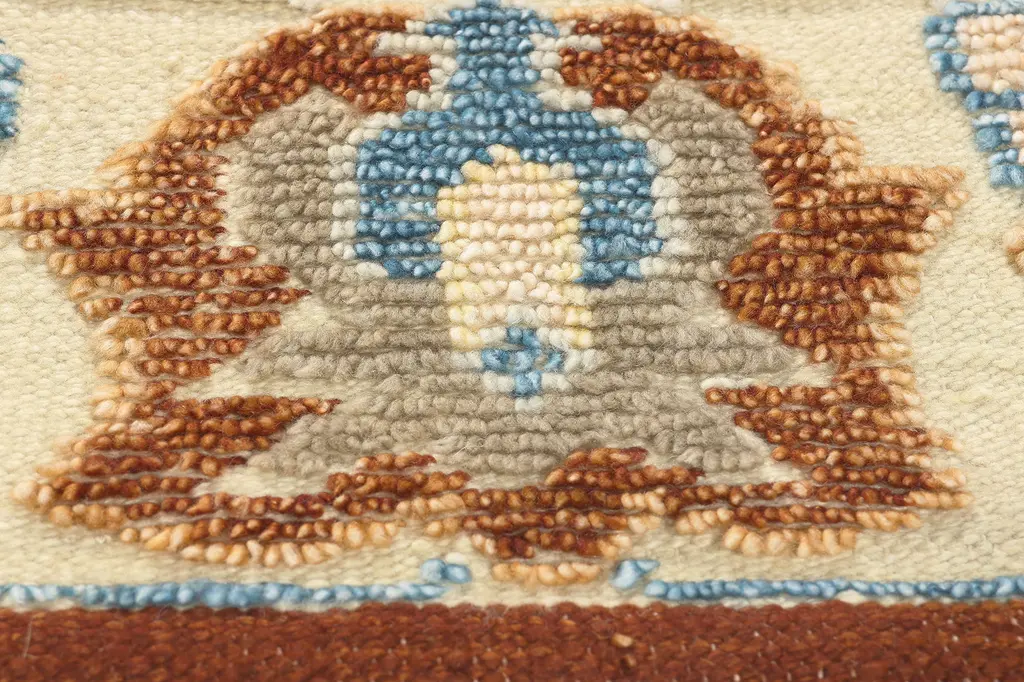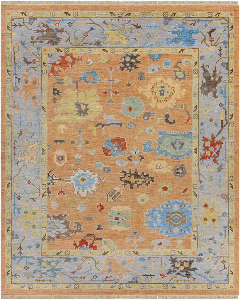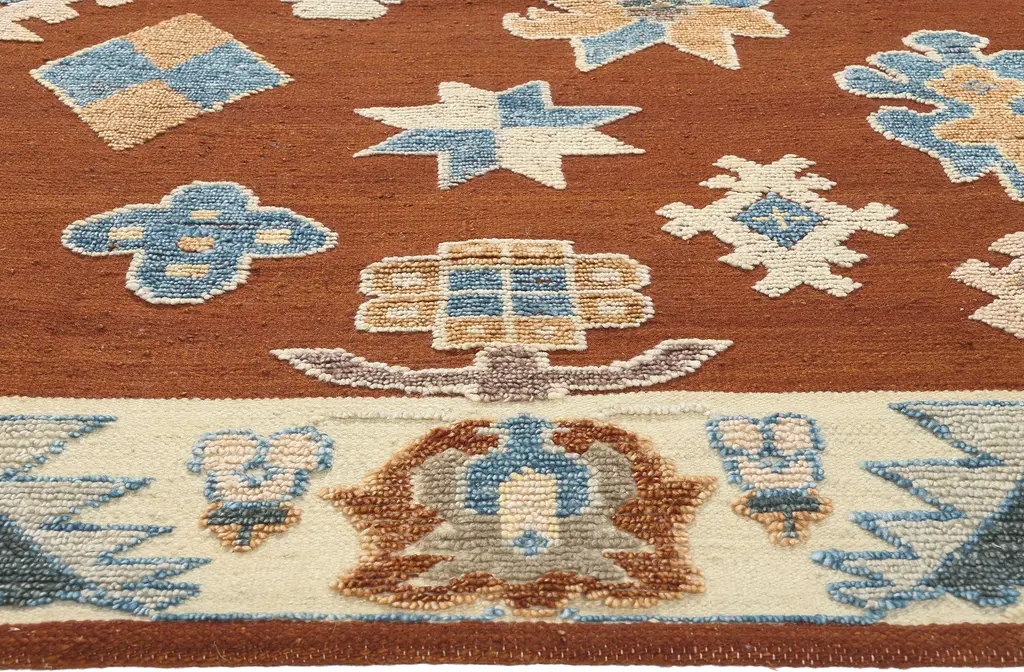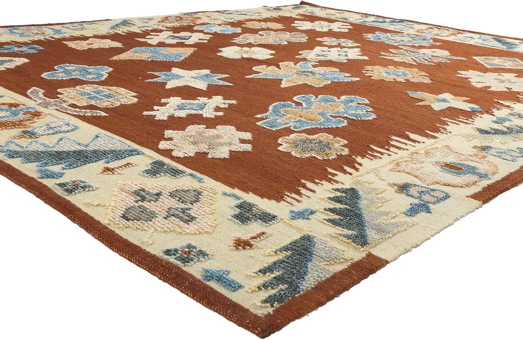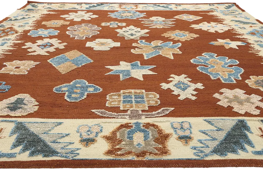 Presenting an exquisite high and low textured Oushak rug that embodies contemporary elegance and modern charm. Revel in the intricacies of its raised design, a testament to impeccable detail and texture that captivates the senses. Stylized florals and enigmatic motifs grace the russet-colored field, lending a sense of enchantment to this unique creation. A high-contrast color palette, anchored by the beige border and russet backdrop, exudes sophistication and timeless allure.
