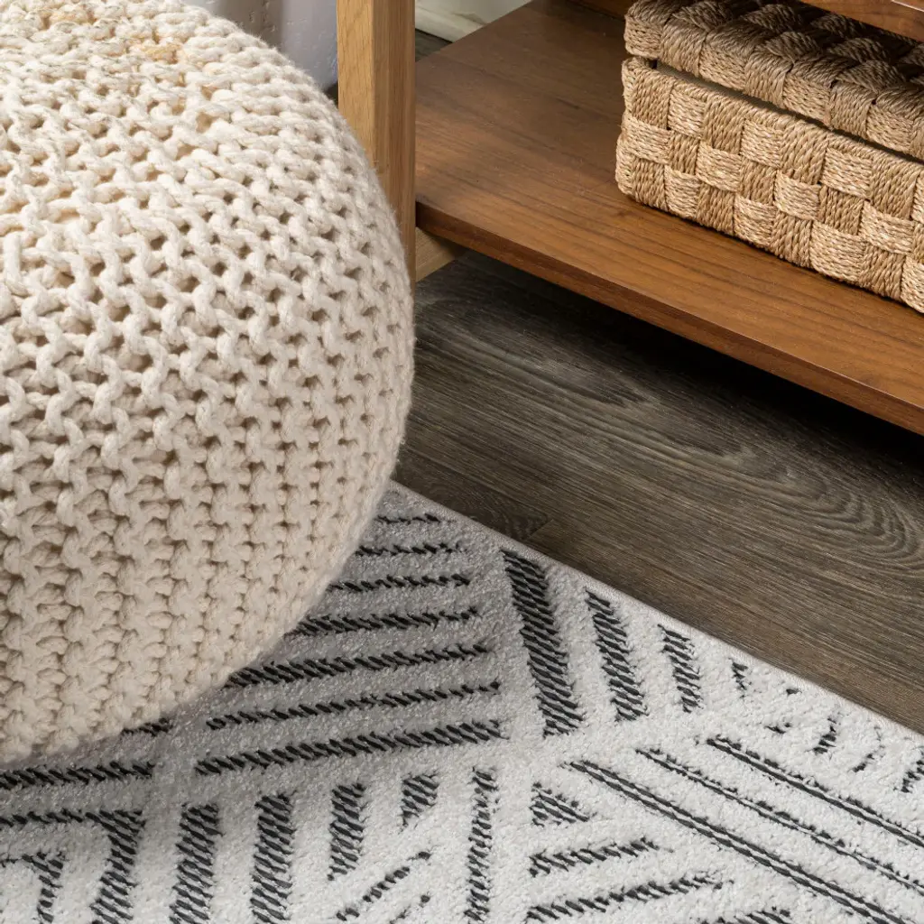 Inspired by Art Deco design, our jazzy geometric rug is power-loomed with a short pile. The all-over pattern is woven on an ivory background. Add some graphic mid-century punch to your living room, dining room, entry, or bedroom with this easy-care rug. Features:• Power loomed with a 0. 31" pile that''s soft and durable• The deep gray and ivory color scheme is a modern take on neutral, graphic abstract rugs• Made from easy-care polypropylene - just sweep, vacuum or hose down with mild soap and water• 100% Polypropylene• No backing, use of rug pad is recommended (sold separately)• Power Loomed in Turkey• Actual Dimension: 3 ft. 11 in. x 6 ft. • Color: White/Black• Thickness measures: 0. 31 in. • Available in multiple sizes and/or colorsRug Care:• Vacuum regularly and spot clean as needed; avoid direct and continuous exposure to sunlight; use brushless vacuum; remove spills immediately; if liquid, blot with clean, undyed cloth by pressing firmly around the spill to absorb as much as possible; for hard to remove stains, professional rug cleaning is recommended; store in a dry, well ventilated area and rotate for consistent wear• Packing and shipping may cause temporary creases in rugs, which will flatten out after a week on the floor; to expedite the process, try back-rolling your rug before laying it down, and then allow ample time for the remaining creases to relax• Please Note: Due to differences in monitors, some rug colors may vary slightly. Lengths and widths may vary from the published dimensions. Patterns may vary slightly according to shape and size selected. About us:Style your floors with JONATHAN Y. By combining fine craftsmanship and design, this New York creative studio is bringing fashion to your floors. The collection mixes sustainable organic materials, vibrant colors and trend worthy styles to create JONATHAN Y''s distinctive catalog of rugs.