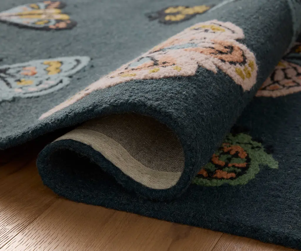 An array of multicolored butterflies take flight against a rich charcoal, 100% wool backdrop, capturing the wonder of a carefully tended butterfly garden. Inspired by the beauty of the English countryside, Highgrove collection rugs are masterfully wool-hooked and carved for added dimension. Part of our Rifle Paper Co. x Loloi collaboration. The layout and scale of our rugs is adjusted to accommodate each available size, and may be different than what is pictured here. Images of each size are available by hovering over the desired size on our desktop site.
