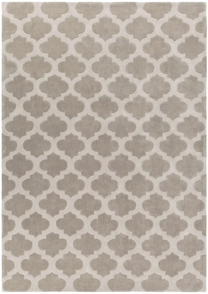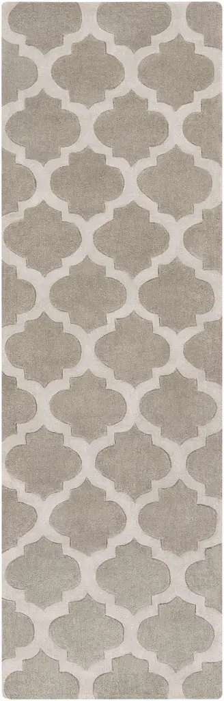 Collection: Highspire Colors: Taupe, Light Gray Construction: Hand Tufted Material: 100% Polyester Pile: Medium Pile Pile Height: 0.46" Styles: Transitional Backing: Canvas Made In: China Thickness: 0.59" Price Range: $$$$$ (Affordable)