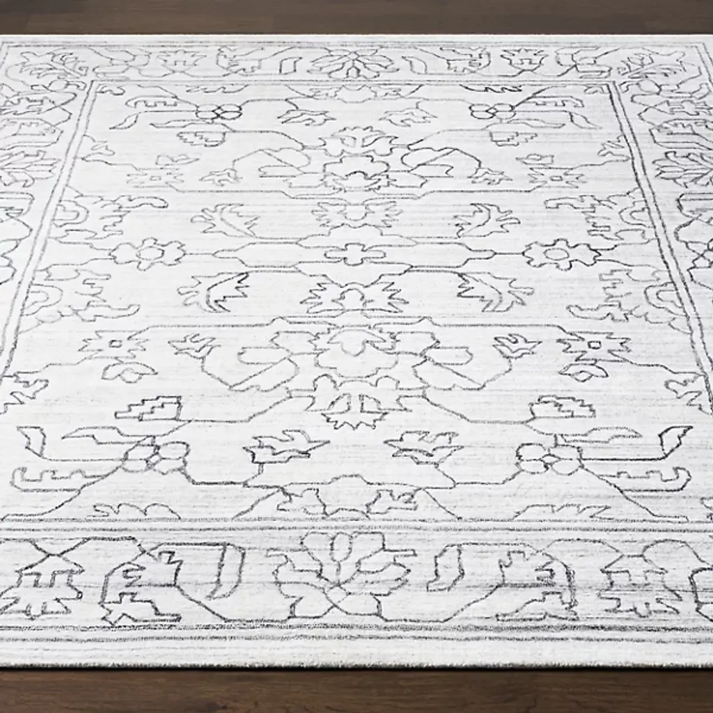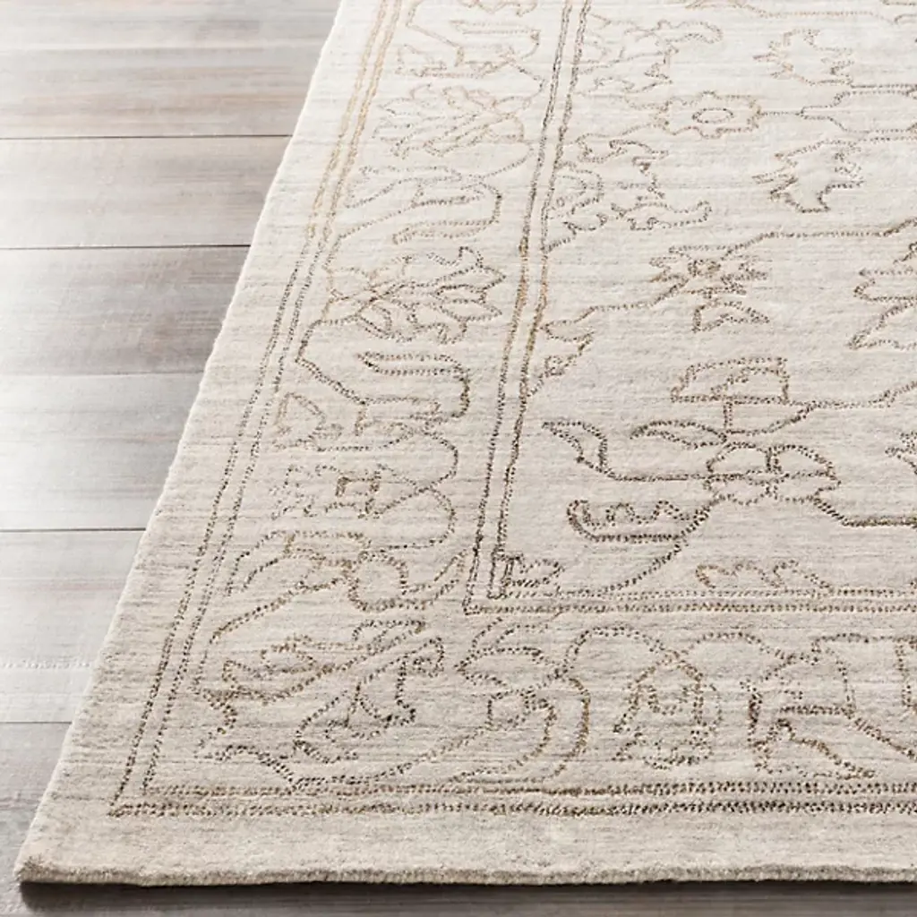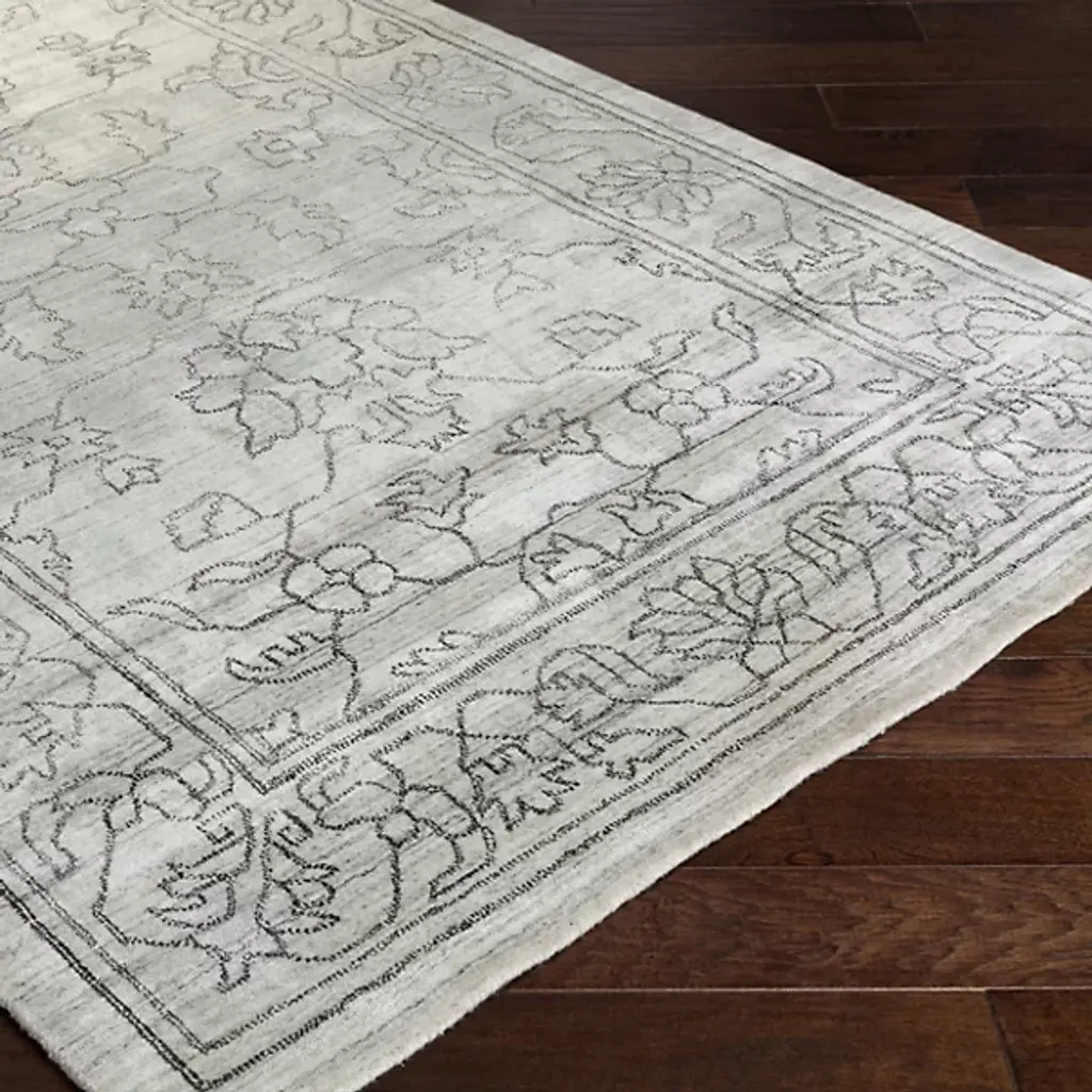 Give your home décor an ornate appearance with the Hightower HTW 3000-3003 Area Rug by Surya. Your area rug is designed with an ornate, floral pattern. The depicted lines elegantly wend and contour, giving this piece a sketched look. This area rug is knotted by hand and is made of 100% viscose.