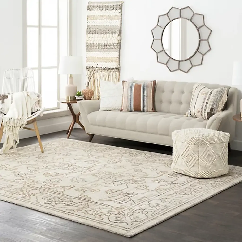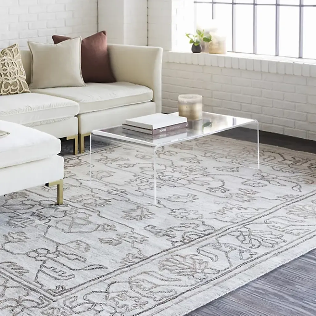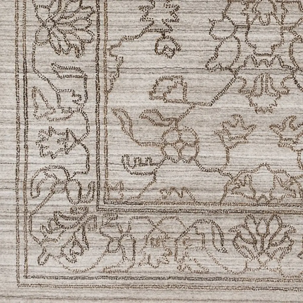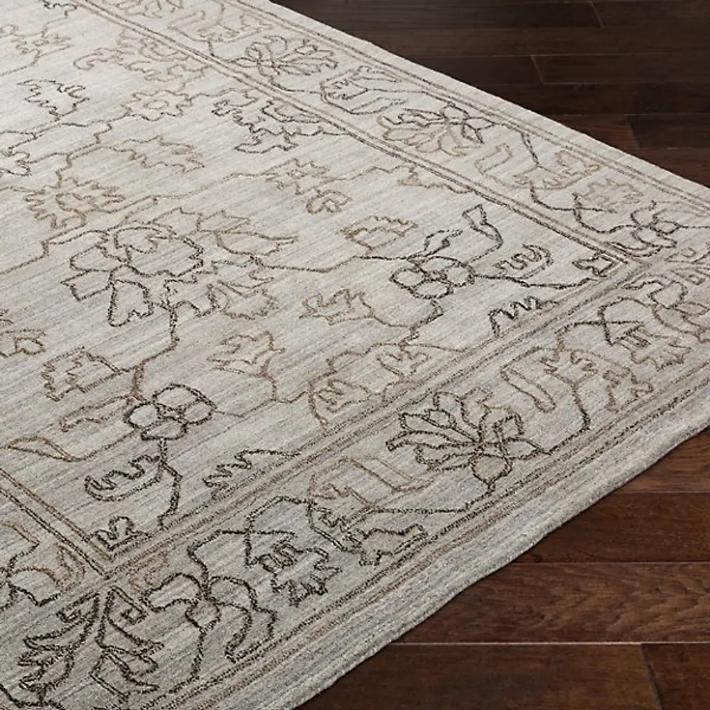 Give your home décor an ornate appearance with the Hightower HTW 3000-3003 Area Rug by Surya. Your area rug is designed with an ornate, floral pattern. The depicted lines elegantly wend and contour, giving this piece a sketched look. This area rug is knotted by hand and is made of 100% viscose.