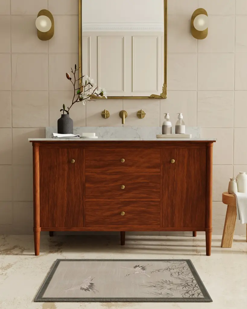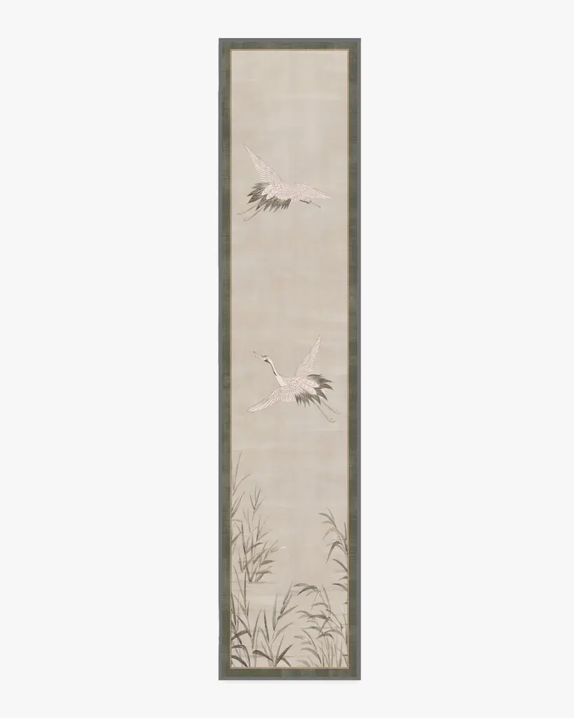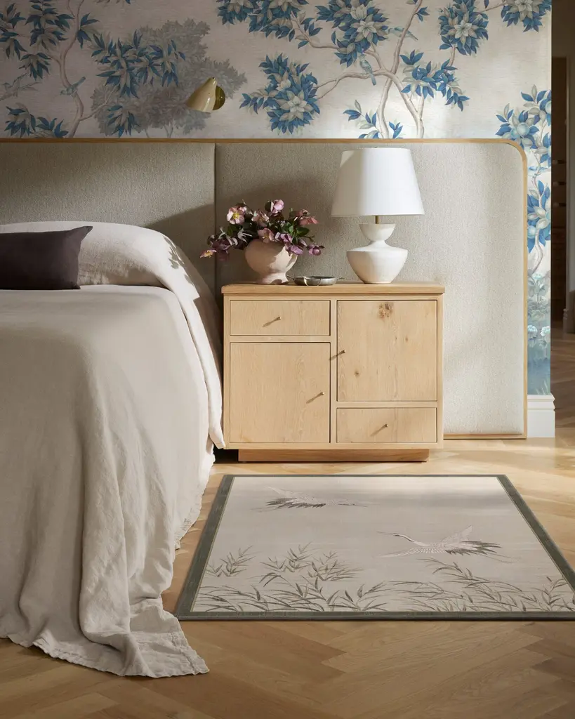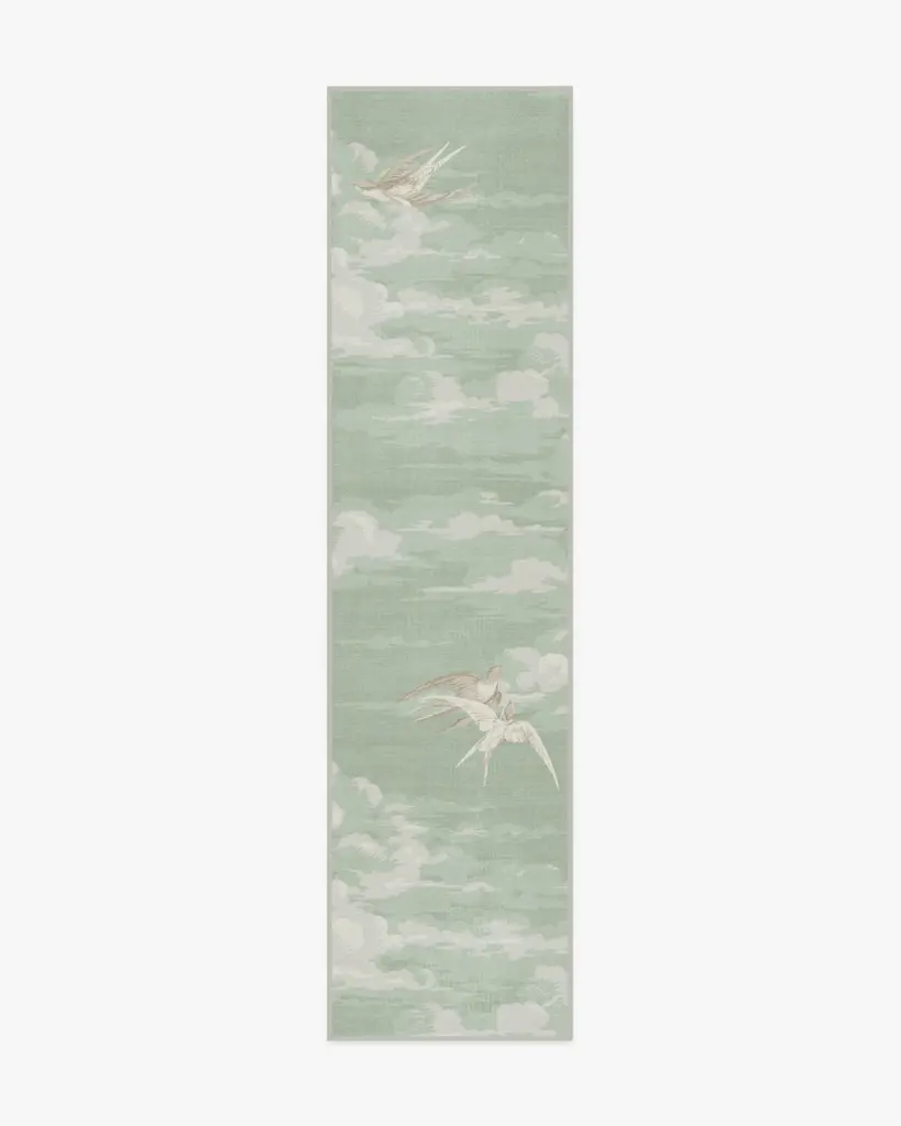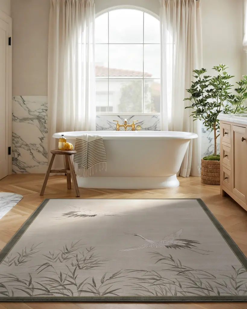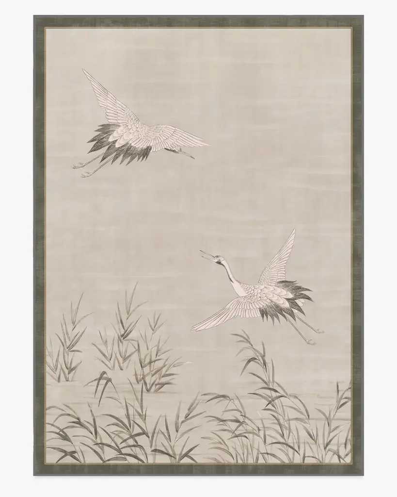 Inspired by the serene feeling of nature, our Gracie Hiko Natural Stone Rug features two gracefully soaring birds. The handpainted feel of the feather detailing, combined with textured strokes of the reeds, adds an artistic touch to the composition. Subtle organic shifts in lighter tones mimic the softness of clouds, adding movement to the design. A color palette of cream, dark warm grey, soft grey, mid-tone neutrals, and gold mixes seamlessly against a neutral grey-beige background. Water-resistant, stain-resistant, and machine-washable. Rug colors may vary slightly according to your device and the lighting in your space.