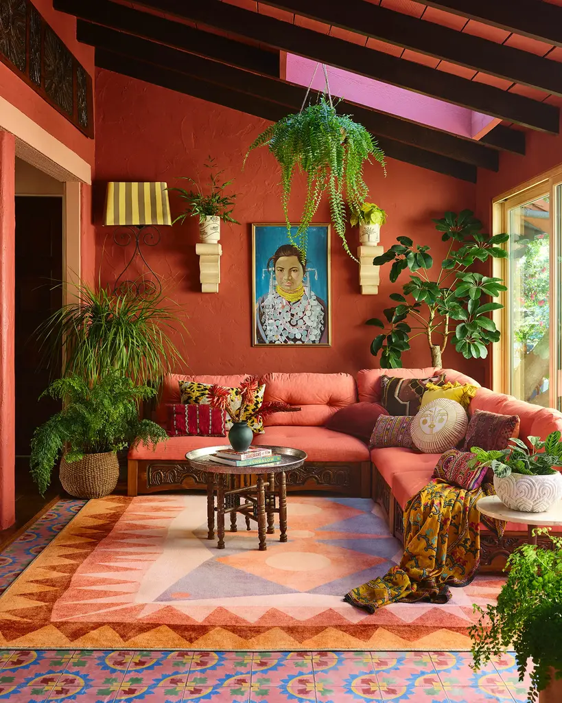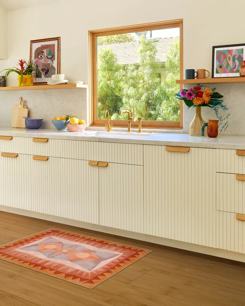 Come home to color and art reminiscent of Hilma af Klint with our Justina Blakeney Hilma Sunset Rug. Inspired by mesmerizing geodes and the enchanting way crystals refract light, this radial triangle design features a geometric play on a sunburst surrounded by soft, luminous edges. Its stunning color palette includes tones of orange, terracotta, pinks, and lavender against an off-white and pink background. Water-resistant, stain-resistant, and machine-washable. Rug colors may vary slightly according to your device and the lighting in your space.