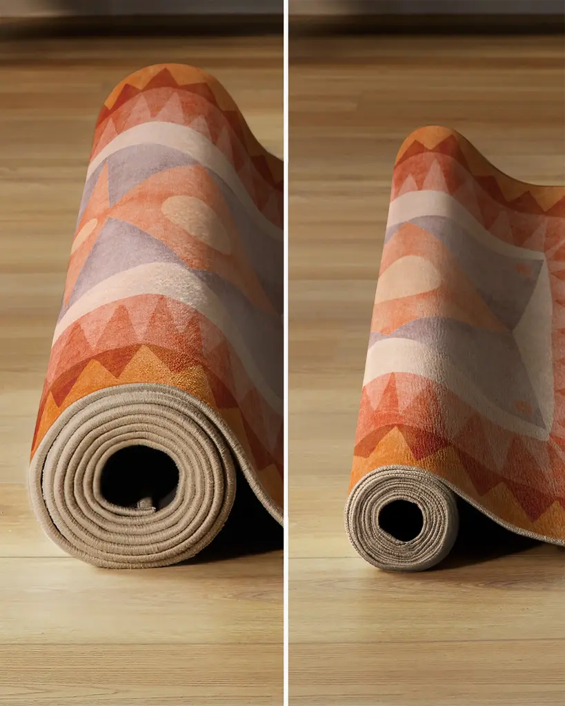 Come home to color and art reminiscent of Hilma af Klint with our Justina Blakeney Hilma Sunset Rug. Inspired by mesmerizing geodes and the enchanting way crystals refract light, this radial triangle design features a geometric play on a sunburst surrounded by soft, luminous edges. Its stunning color palette includes tones of orange, terracotta, pinks, and lavender against an off-white and pink background. Water-resistant, stain-resistant, and machine-washable. Rug colors may vary slightly according to your device and the lighting in your space.