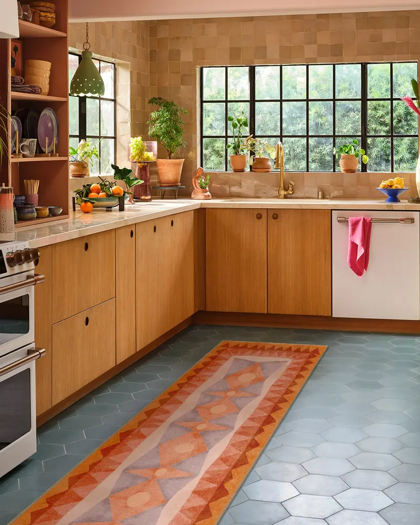 Come home to color and art reminiscent of Hilma af Klint with our Justina Blakeney Hilma Sunset Rug. Inspired by mesmerizing geodes and the enchanting way crystals refract light, this radial triangle design features a geometric play on a sunburst surrounded by soft, luminous edges. Its stunning color palette includes tones of orange, terracotta, pinks, and lavender against an off-white and pink background. Water-resistant, stain-resistant, and machine-washable. Rug colors may vary slightly according to your device and the lighting in your space.