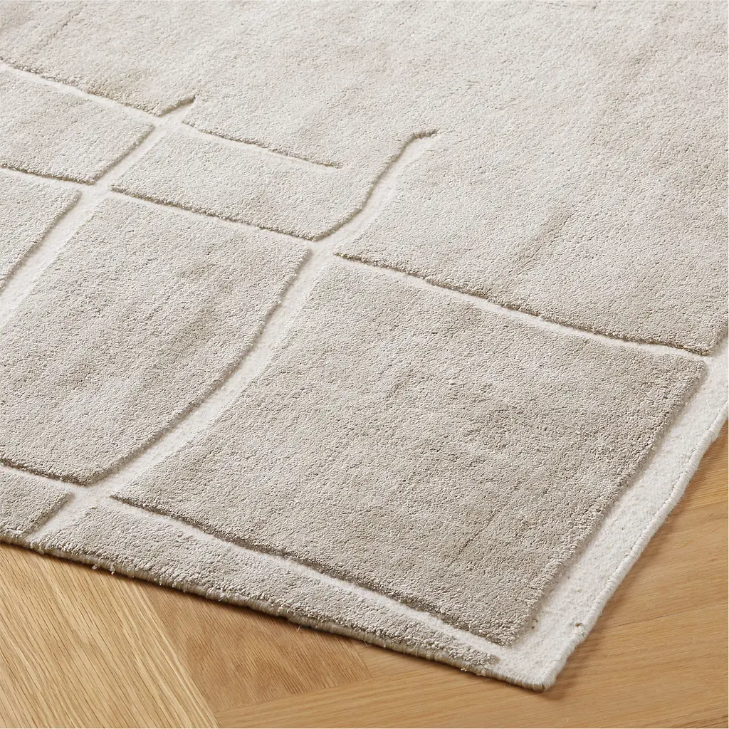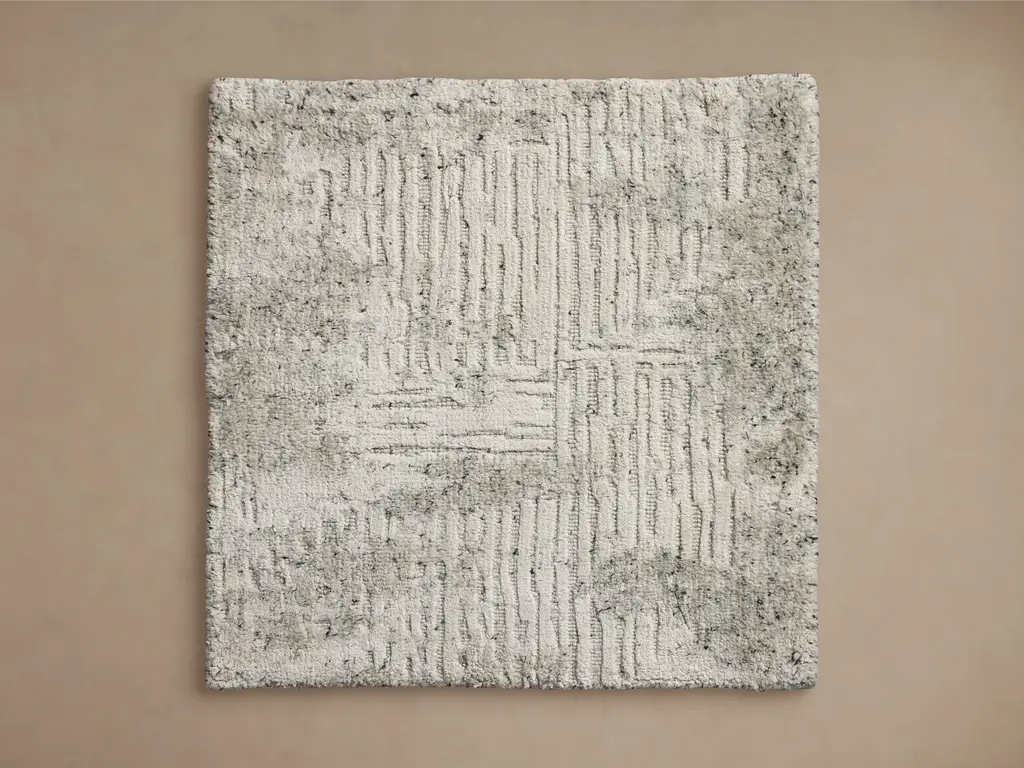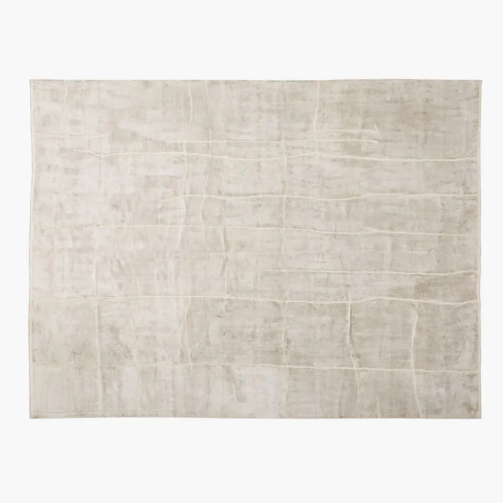 Woven from a mix of wool and silky rayon threads, this plush pile rug feels amazing underfoot. Silvery-grey wool base is overlaid with soft white lines creating an abstract crocodile pattern. A sophisticated nod to the classic animal print. CB2 exclusive. How will it look in your room? 12"x12" rug samples are available in stores for a fee refundable upon return of the sample.