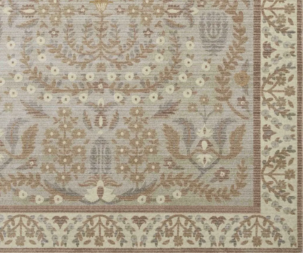 Trailing vines of delicate leaves create a detailed, botanical pattern on our Anika rug. Powerloomed in Turkey, it has a soft, shed-resistant file that is both fade and stain resistant. Part of our Rifle Paper Co. × Loloi collection. The layout and scale of our rugs is adjusted to accommodate each available size, and may be different than what is pictured here. Images of each size are available by hovering over the desired size on our desktop site.
