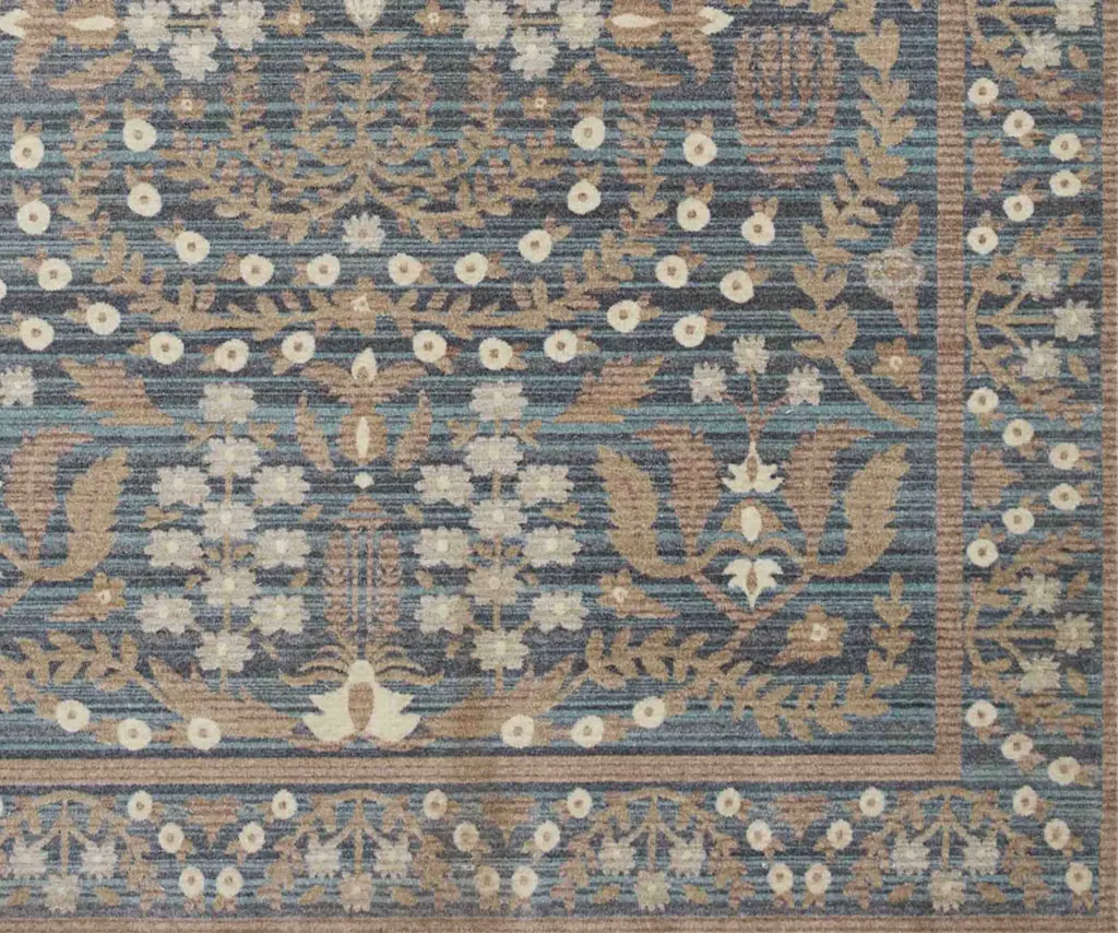 Trailing vines of delicate leaves create a detailed, botanical pattern on our Anika rug. Powerloomed in Turkey, it has a soft, shed-resistant file that is both fade and stain resistant. Part of our Rifle Paper Co. × Loloi collection. The layout and scale of our rugs is adjusted to accommodate each available size, and may be different than what is pictured here. Images of each size are available by hovering over the desired size on our desktop site.