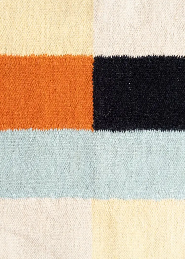 Holy Spice - Design Kilim Rug Liver Studio Milan Wool Carpet Cotton HandwovenThis Rugs is designed by Liver, a creative studio based in Milan, Italy. Composed from a geometrical grid, colours overlap and combine with vibrancy.handmade in India, designed in Italy.Size can be customized, suitable for home, showroom or a hotel.Designed by Liver, @liverforsupper.
