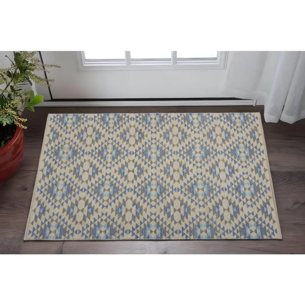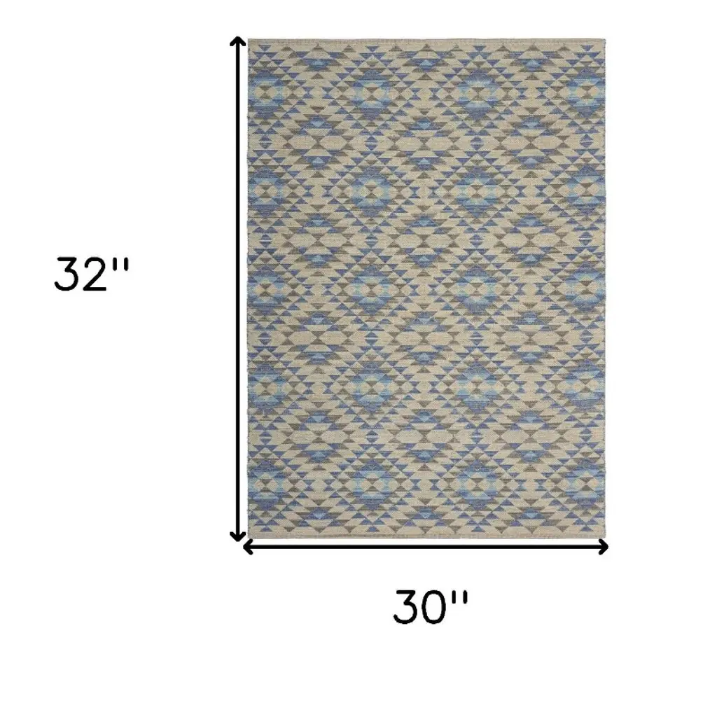Packed with patterns and colors to allure the gaze of the guest, this Blue Decorative Lattice Area Rug will be a stunning accent to adorn your contemporary interior. Flaunting the eclectic shades of blues and beige to create decorative lattice patterns for visual harmony. Made of cotton and polyester blend to ensure durability and retain color intensity for years while being easy to clean. The flatweave construction adds to a smooth and soft surface texture making it an ideal choice for indoor areas with heavy foot traffic. Upholding a classy look with a touch of bohemian flair, this versatile area rug will be a worthy addition to induce an inviting ambiance into your place. 30” x 32” x 0.3”