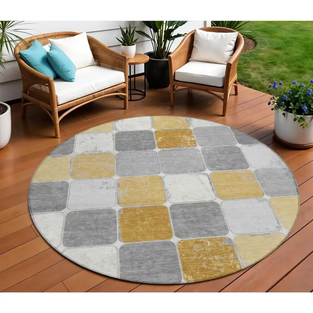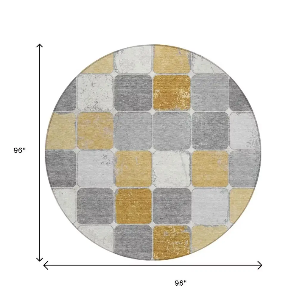 Homeroots 8' Gold And Gray Round Geometric Washable Indoor Outdoor Area Rug