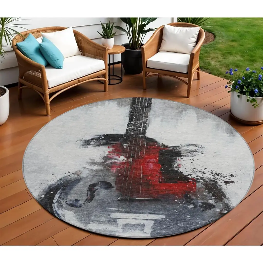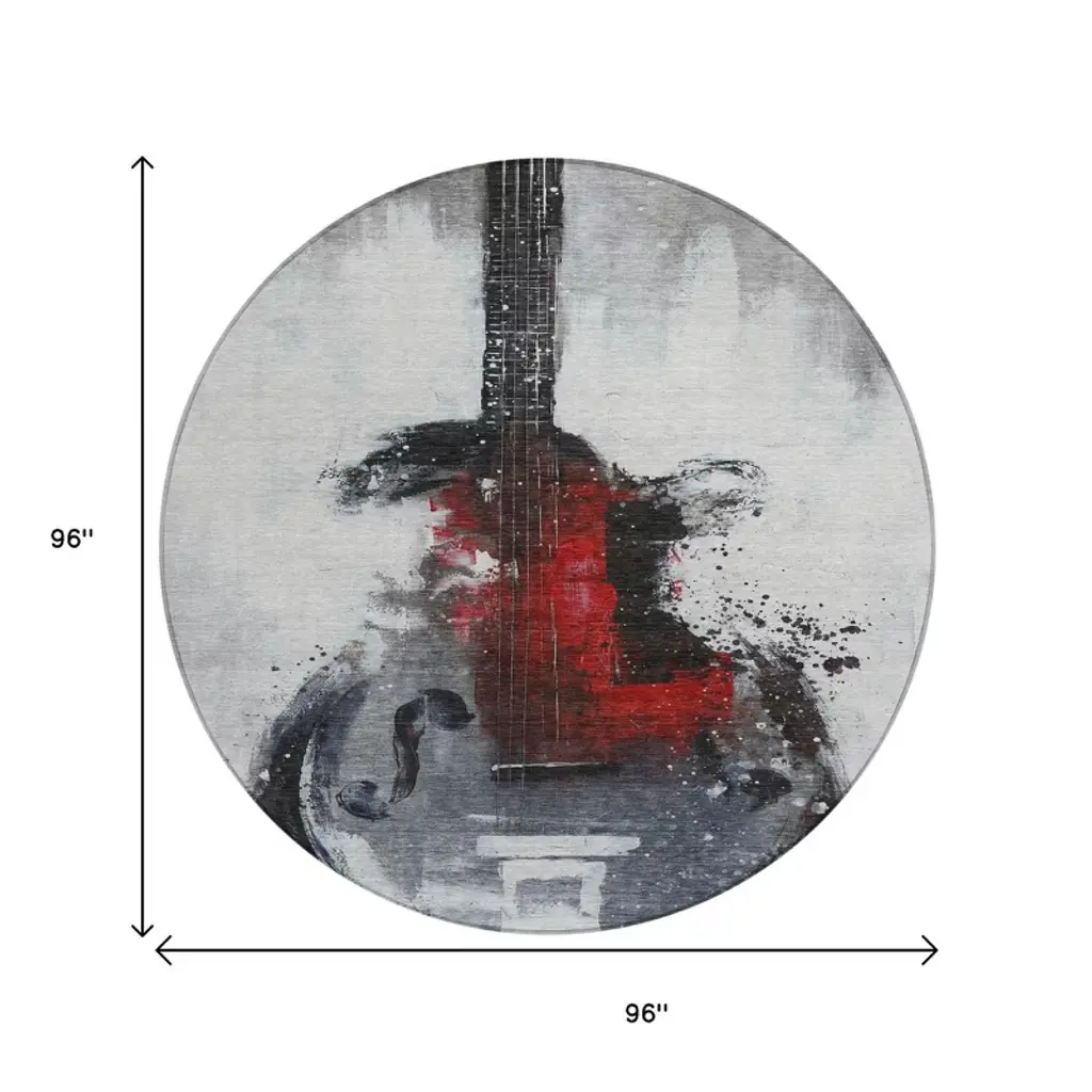 Homeroots 8' Gray Charcoal And Red Round Abstract Washable Indoor Outdoor Area Rug
