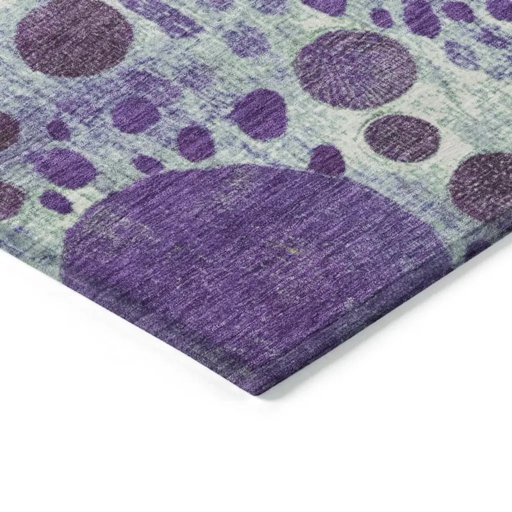 This 8-foot purple green and ivory round geometric washable indoor outdoor area rug, is a great way to add warmth to a room. This geometric round shaped rug features a geometric pattern in purple, green, and ivory that combines a good looking print with a unique and updated shape. The mix of shape, color, and design gives this rug refreshing visual interest. Ideal for outdoor spaces or high traffic areas with kids and pets, this rug is made from heavy duty polyester that is stain resistant to help repel water, dirt, and stains. Versatile in use, durable, and easy to maintain, this rug is an ideal solution to add a decorative and inviting touch to your indoor or outdoor space. 96-inch h x 96-inch w x 0.19-inch d.