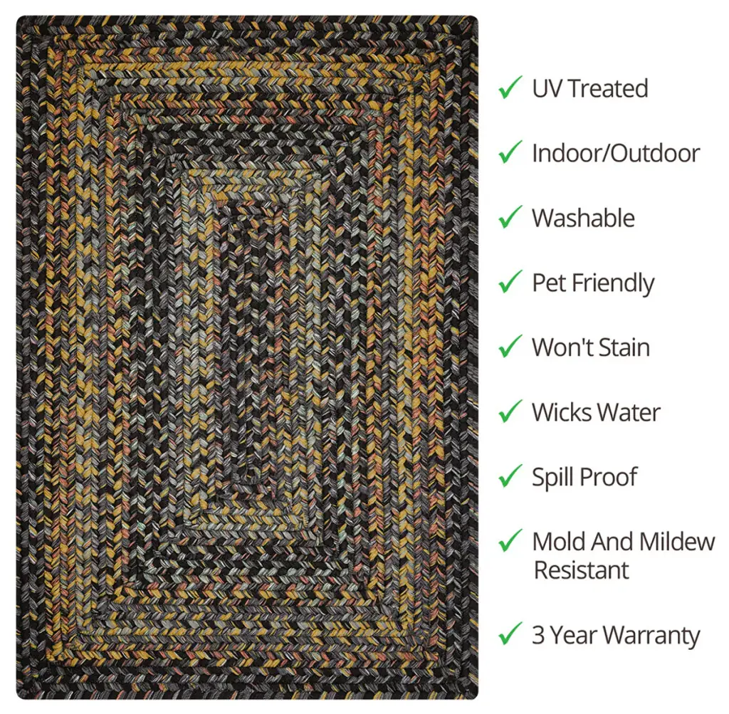 Homespice Decor Black Forest Indoor/Outdoor Braided Rug 20" x 30" RectangularA striking combination of blacks and greys flecked with mustard brings to mind the dark beauty of winter forests. There is no need to compromise beauty for durability. Our Ultra Durable indoor/outdoor rugs are amazing. They resist stains from food, pets, and liquids, while adding color, texture and interest to all your living spaces. This amazing absorbent material leaves the surface below dry with most moderate spills. To clean, simply run under water in your sink or use a hose.Care Instructions : Rinse or hose with water and lay flat to dry. May use a mild detergent. Vacuum regularly using a hard surface attachment. Vacuuming with a beater brush is not recommended.Double Sided Backing Ultra Durable Braided Rugs60% Olefin , 20% viscose, 20% polyester