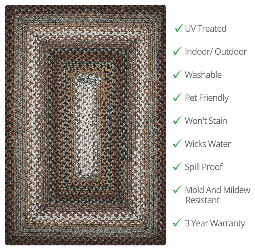 Homespice Decor Midnight Moon Indoor/Outdoor Braided Rug 20" x 30" RectangularDramatic shades of black, grey and slate give way to subtle hints of cream - like moon beams peeking out from a night sky. There is no need to compromise beauty for durability. Our Ultra Durable indoor/outdoor rugs are amazing. They resist stains from food, pets, and liquids, while adding color, texture and interest to all your living spaces. This amazing absorbent material leaves the surface below dry with most moderate spills. To clean, simply run under water in your sink or use a hose.Care Instructions : Rinse or hose with water and lay flat to dry. May use a mild detergent. Vacuum regularly using a hard surface attachment. Vacuuming with a beater brush is not recommended.Double Sided Backing Ultra Durable Braided Rugs60% Olefin , 20% viscose, 20% polyester