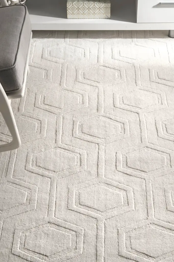 Bring in style and contemporary look to your decor with this hand-tufted wool rug. It has a beautiful embossed hexagon patterned, which enhances the depth of any room it's placed in. The soft wool fibers create a cozy texture under foot while promising durability. With our wide assortment of colors and sizes, make the most of your time at home with our pet-friendly and easy to clean area rugs.