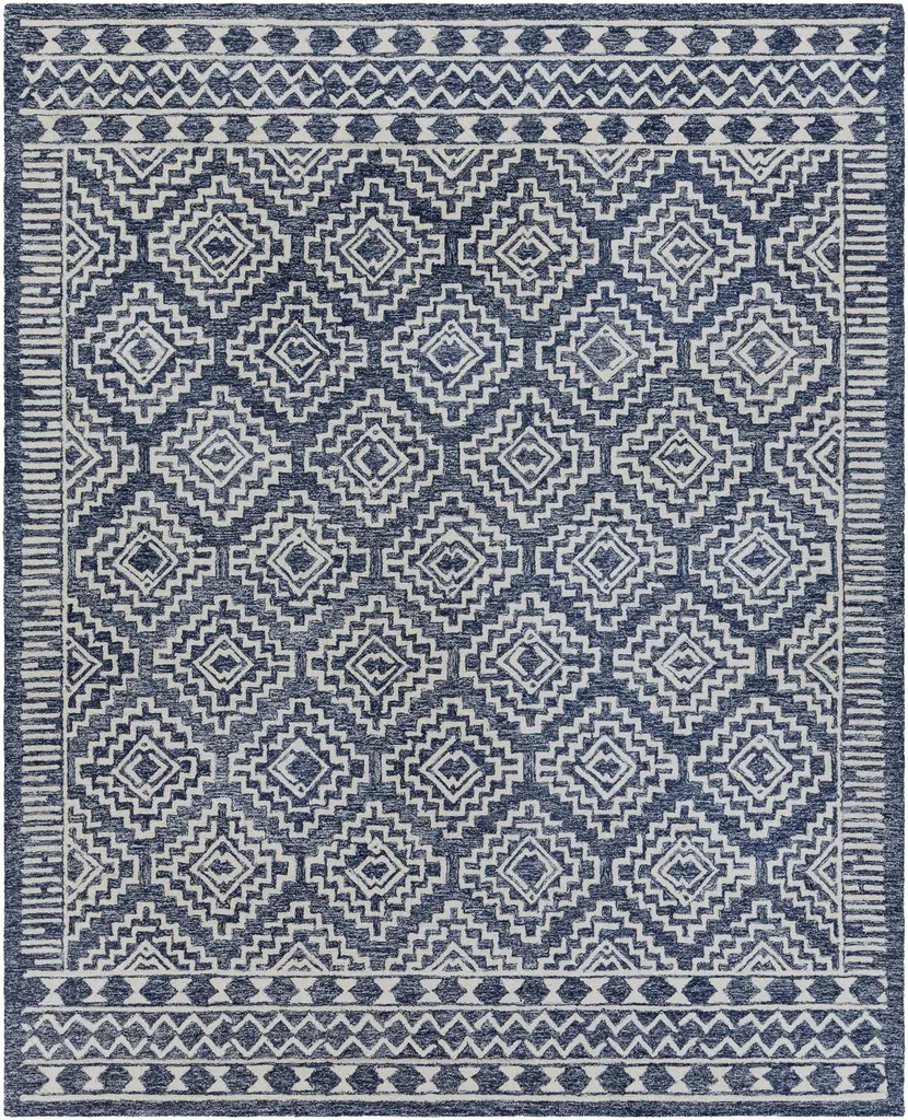 Collection: Horton Colors: Beige, Navy, Light Blue Construction: Hand Tufted Material: 100% Wool Pile: Medium Pile Pile Height: 0.24" Styles: Transitional,Bohemian Backing: Canvas Made In: India Thickness: 0.39" Price Range: $$$$$ (Affordable)