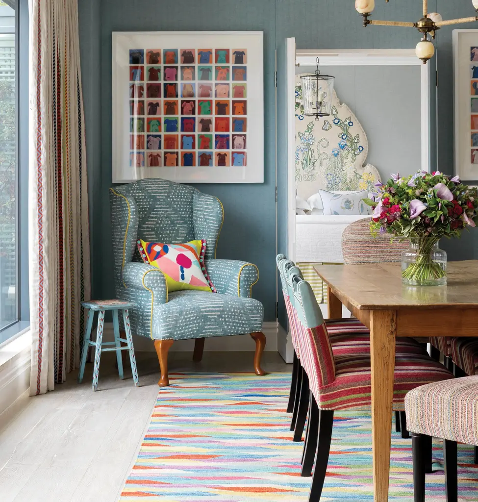 One of the timeless creations from the design collaboration between Annie and Kit Kemp, co-owner and Creative Director for Firmdale Hotels. Drawing inspiration from a one of a kind antique weaving, this incredible flatwoven wool rug contains over twenty colors, kilim woven together as geometric diagonally interlocking stripes. A myriad of marled shades from Soft Blue through Aqua to Sprout and Leaf create a harmonious composition with notes of Spice, Russet, Lavender, Coral and Gold. Annie and Kit are united by their passion for colorful and carefree design, redefining contemporary Arts and Crafts for everyday life.