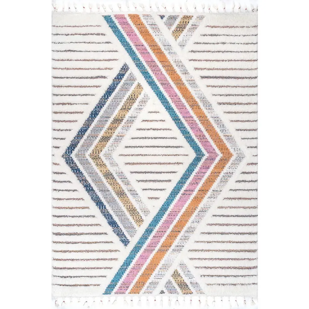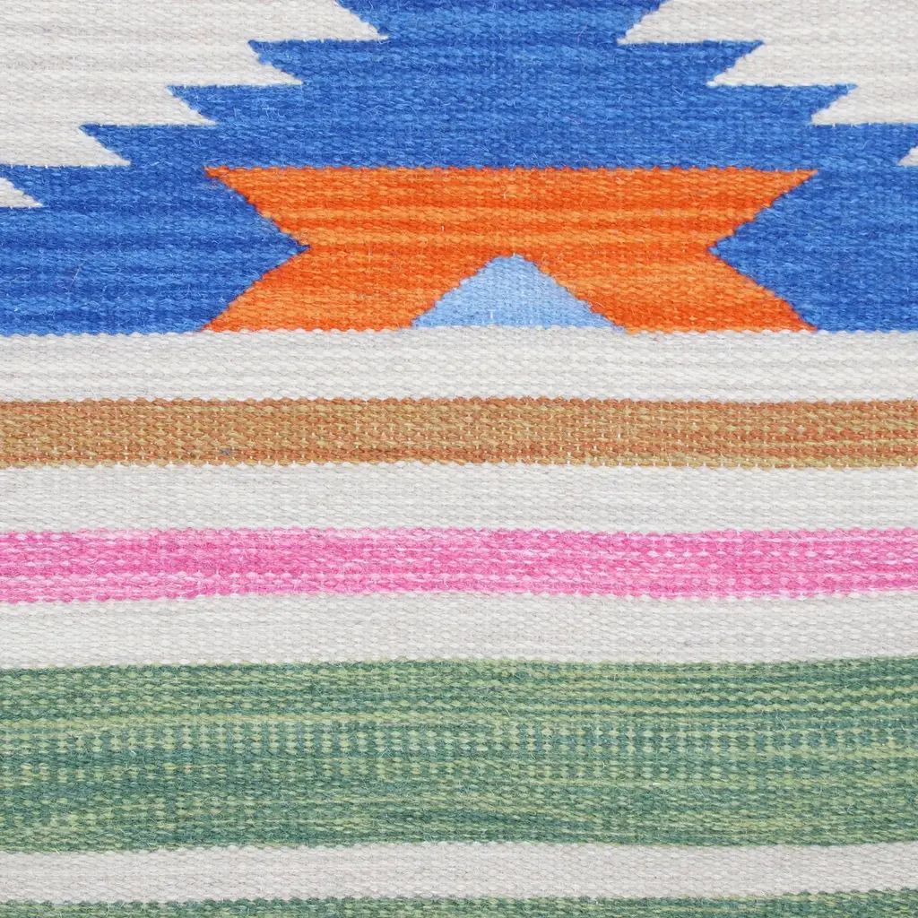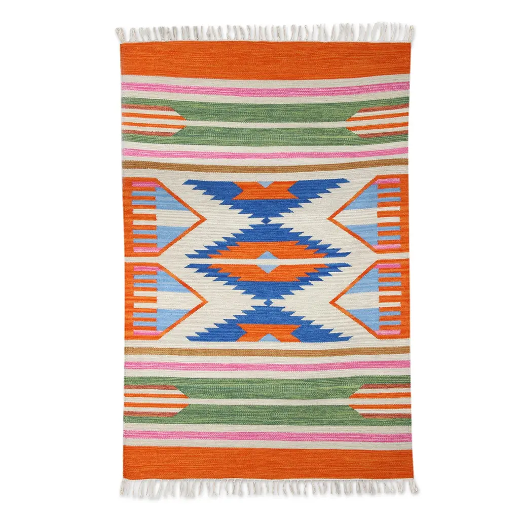 Flanked by colorful stripes, a geometric hourglass figure centers this area rug from India. Sonik Sethi presents this rug, which is handwoven from wool on a traditional loom. Fringes accentuate this rug at each end.