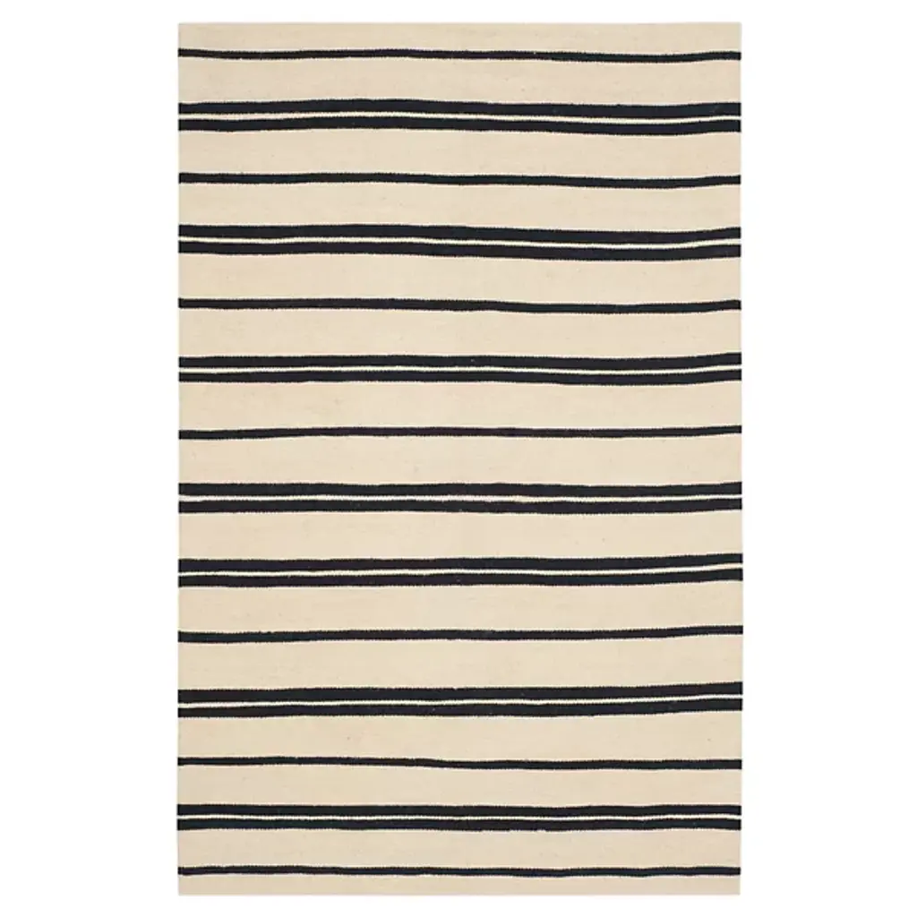 The classic motif of our Hudson Stripe Black rug takes a familiar but unexpected turn with bold and fine lines of charcoal grey on sand.