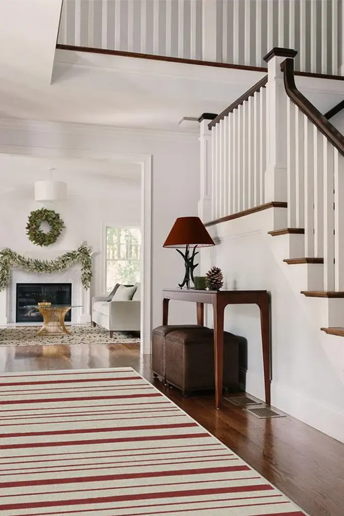 Ring in the holidays with our Hudson Stripe Red Rug. Featuring a mix of bold and fine lines, tinted in candy cane hues of farmhouse red and pearl, this season-perfect rug lends a festive pop of color and versatility to your home's decor. Water-resistant, stain-resistant, and machine-washable.