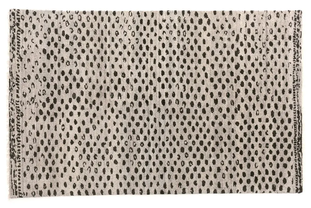 The Hugo Hand-Knotted area rug features a charcoal brown leopardlike pattern on a pale grey background. The goes-with-anything color combination is super thick and plush perfect for bedrooms and family spaces.